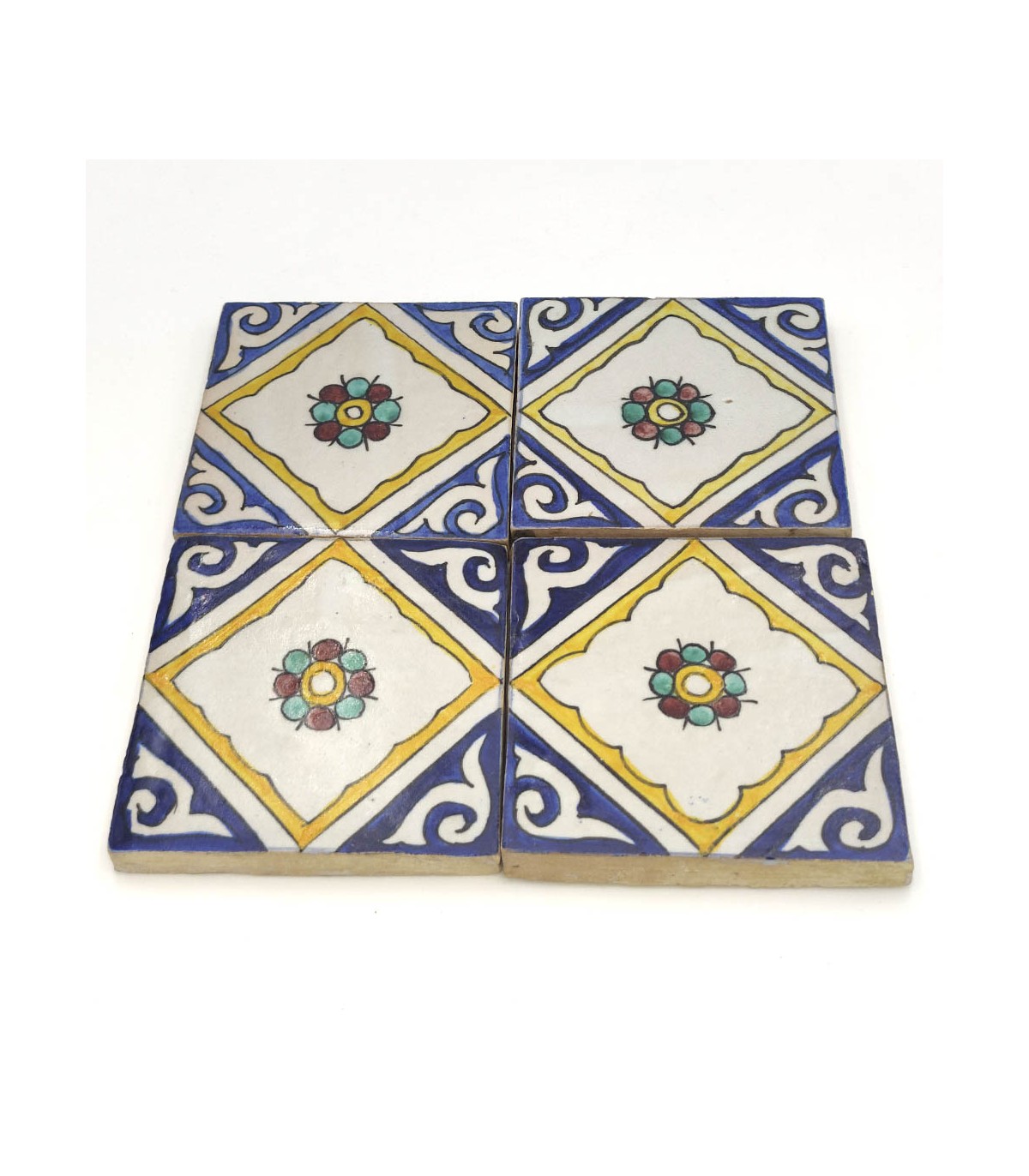 Andalusische Fliesen mit arabischen Motiven von hand gefertigt.Ideal für den Fußboden als dekoratives Stück, um ein Mosaik zu erstellen, schneiden, etc..Maße: 10 x 10 CmGrosor: +/-15 mm
