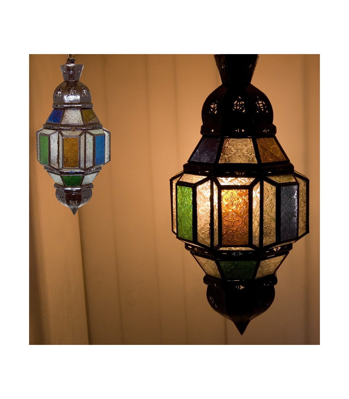 Lampe im arabischen Stil mit geometrischen Zeichnungen und farbigen Kristallen.