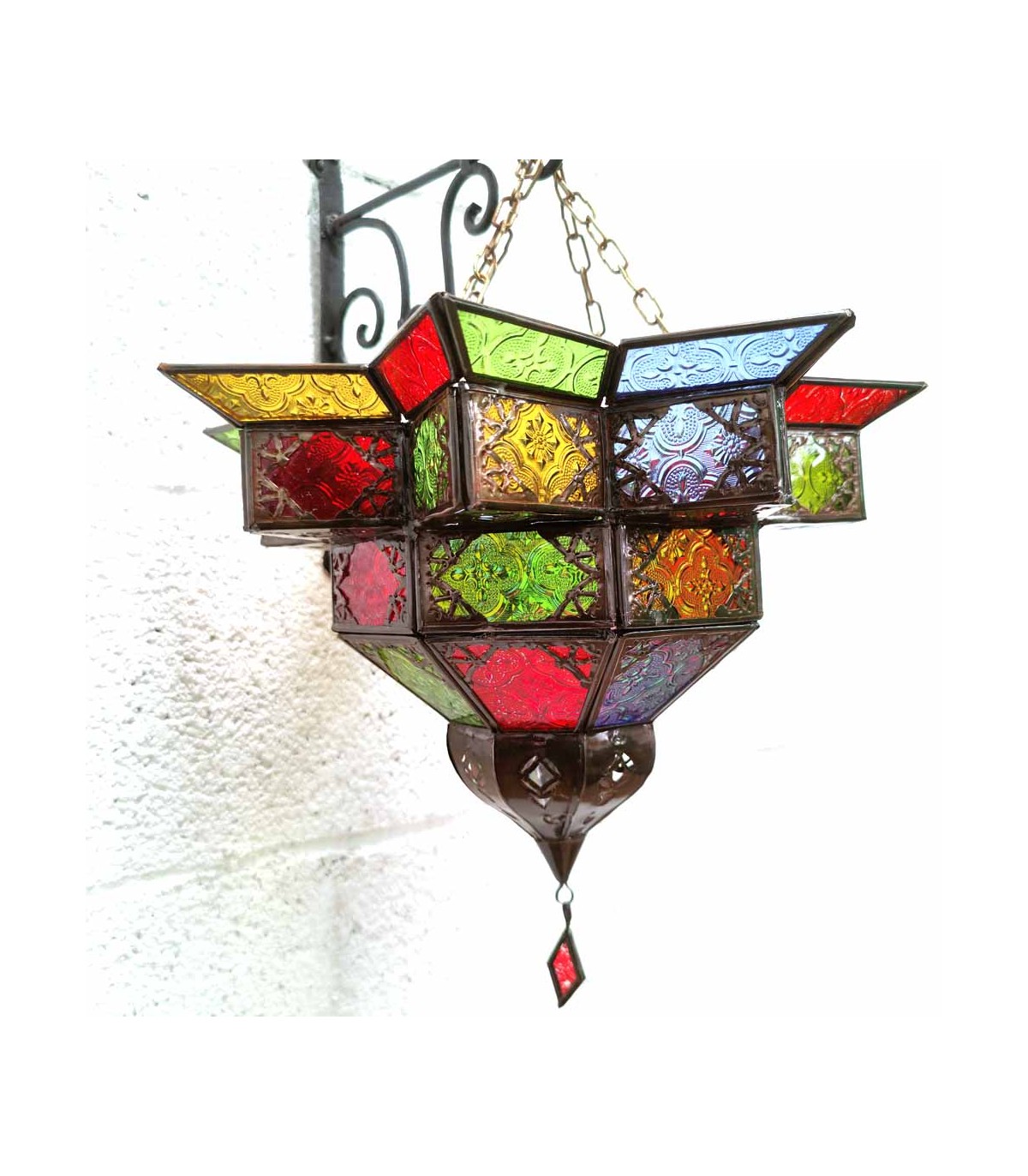 Lampe im arabischen Stil mit geometrischen Zeichnungen und farbigen Kristallen.