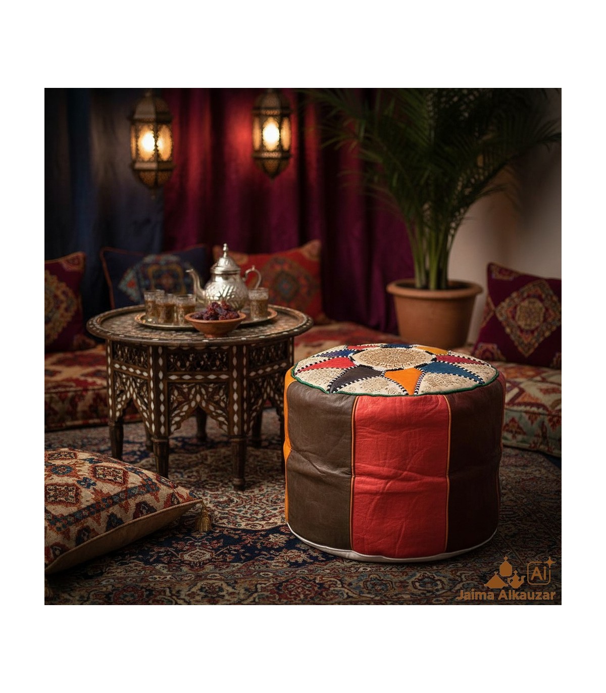 Hoher marokkanischer arabischer Leder-Puffbezug 100 % – marokkanisches Kunsthandwerk – Alwanii-Modell