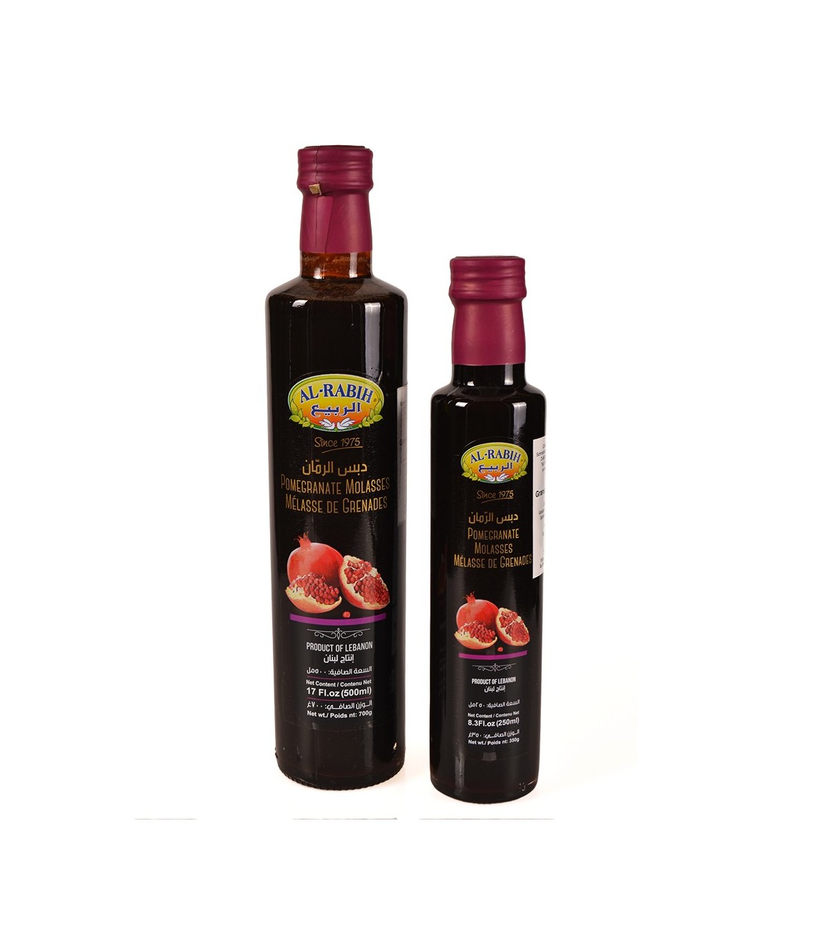 Die Granatapfelmelasseoder Granatapfelsirup ist eine in der arabischen Küche weit verbreitete Zutat, die aus einer Reduzierung des Safts der Früchte hergestellt wird. Zucker und Zitronensaft werden normalerweise hinzugefügt und bieten schließlich ein Produkt von Karamellkonsistenz und einer schönen rubinroten Farbe.