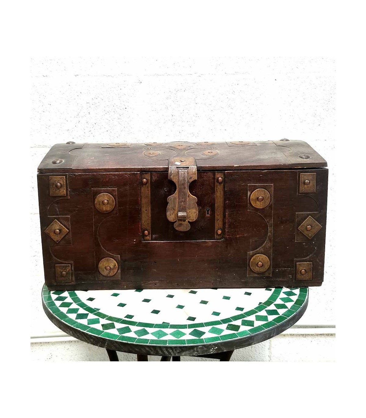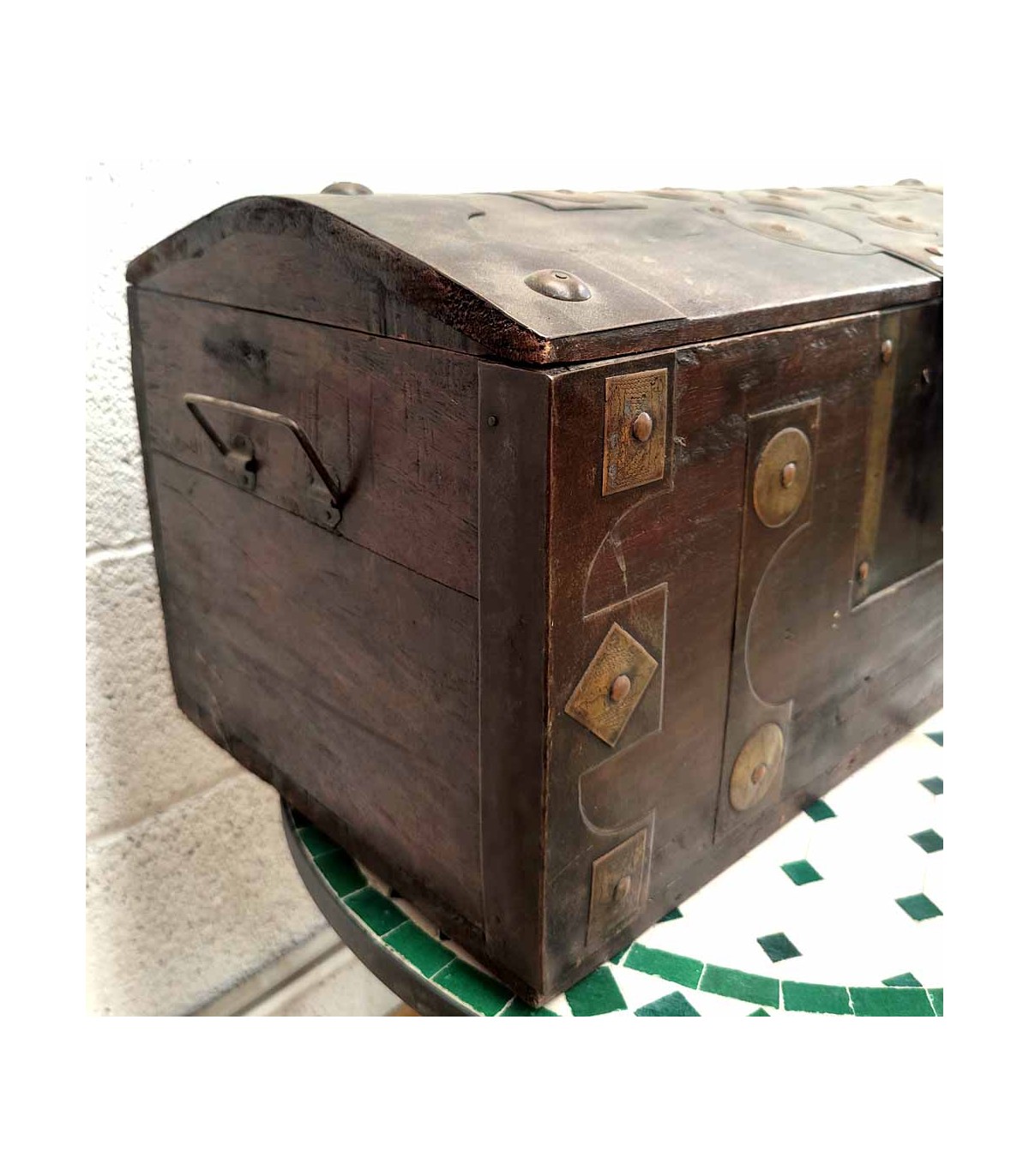 In Mauretanien handgefertigte Holztruhe mit Metallnieten verziert. Tuareg-Stil. Vintage-Koffer, der dem der berühmten Vikings-Serie sehr ähnlich ist.