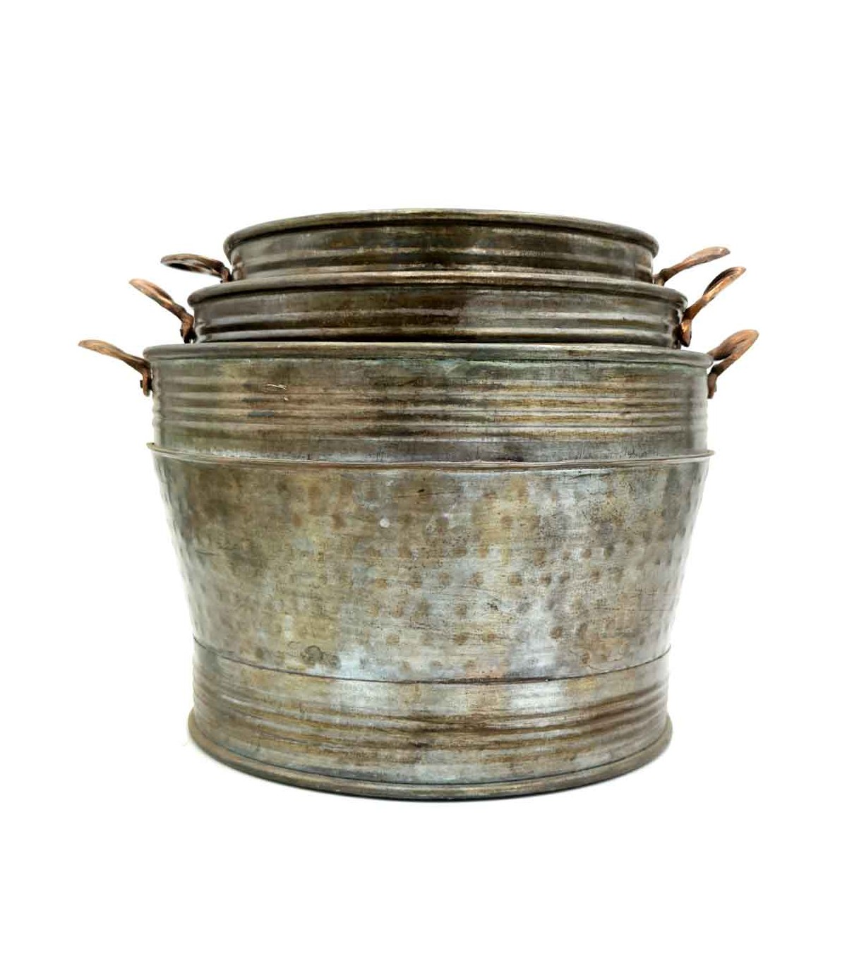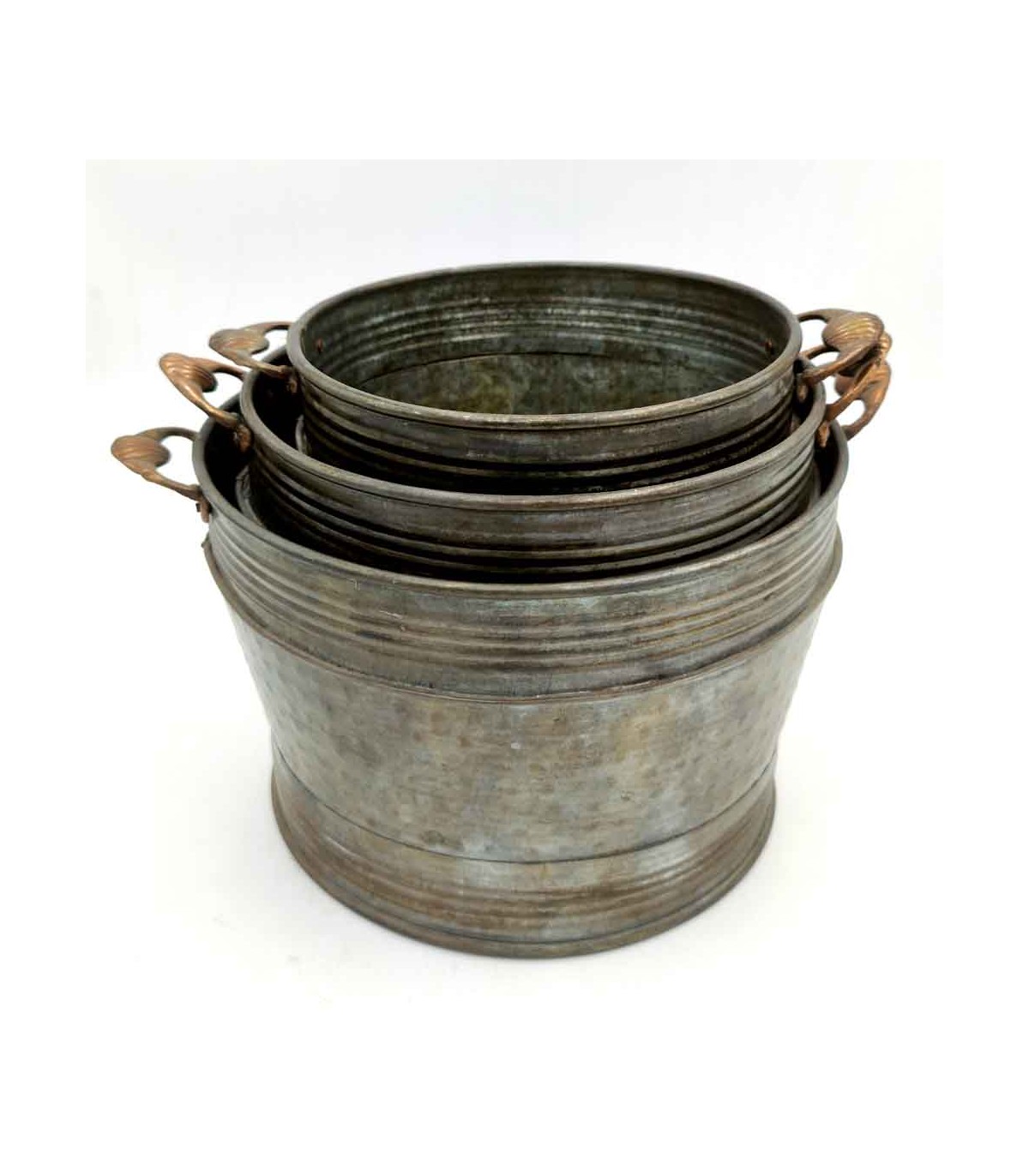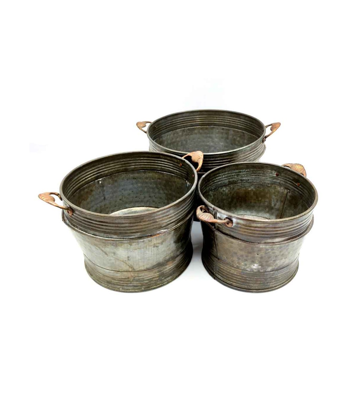 Set mit 3 Vintage-Körben, ideal zum Dekorieren von Innenhöfen, Terrassen oder Dekorationen im Industriestil. Als Pflanzgefäß, Objekthalter, Obstschale.