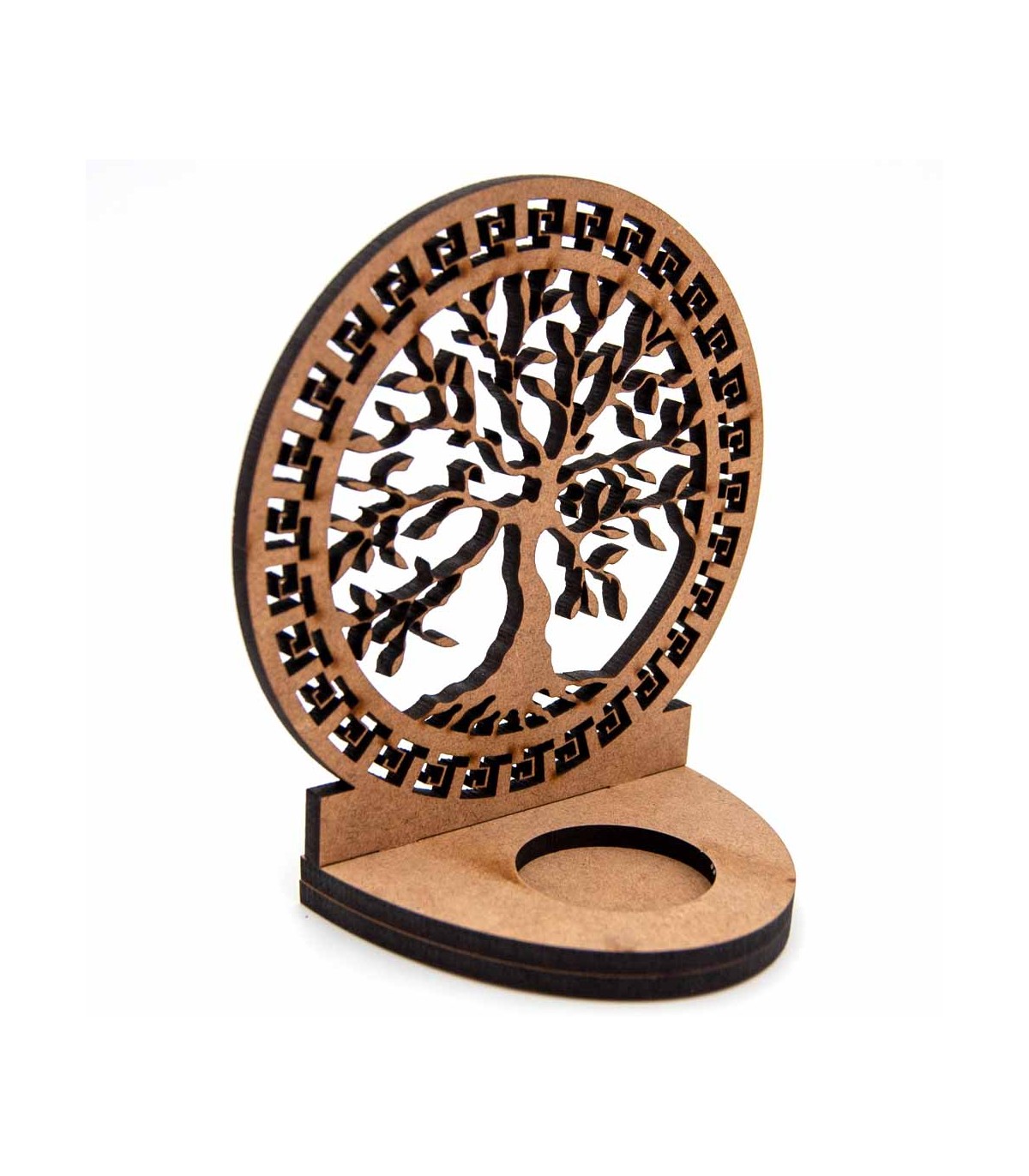 Kerzenhalter aus Holz, verziert mit einem vom Baum des Lebens inspirierten Gitter.