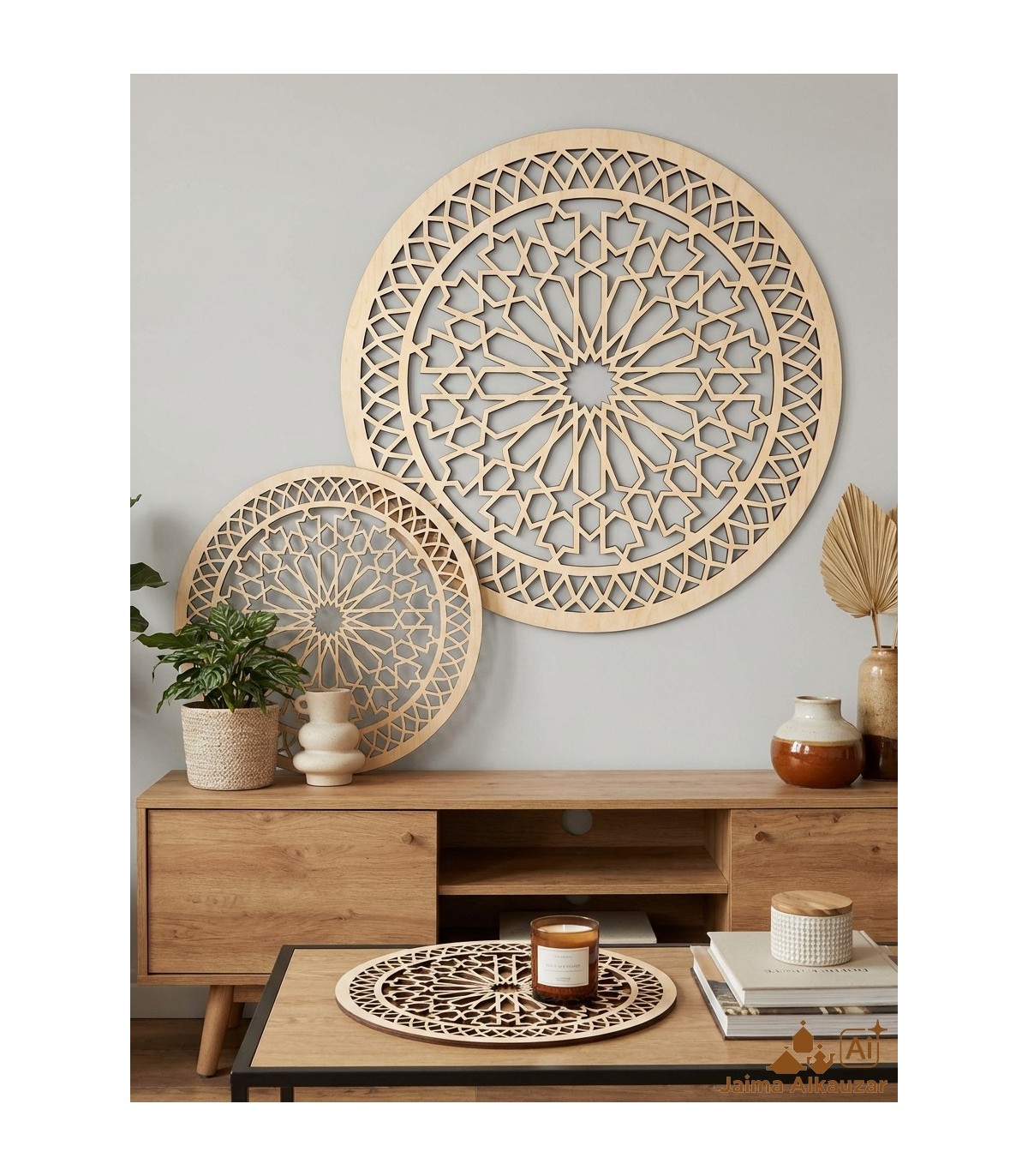 Verwandeln Sie Ihren Raum mit diesem exklusiven dekorativen Arabeskenbild, das aus Holz gefertigt und mit hochpräzisem Laserschnitt versehen ist. Das Dawar Modell bietet ein kompliziertes und elegantes Design, das die reiche Tradition der orientalischen und andalusischen Dekoration widerspiegelt und jedem Ambiente einen anspruchsvollen Touch verleiht. Sein einzigartiger Stil und seine detaillierten Details machen es zur perfekten Wahl, um den Stil Ihres Hauses zu verbessern. Ideal zum Aufstellen im Wohnzimmer, Esszimmer oder Flur, wird dieses dekorative Element eine warme und exotische Atmosphäre in Ihrem Zuhause schaffen.
