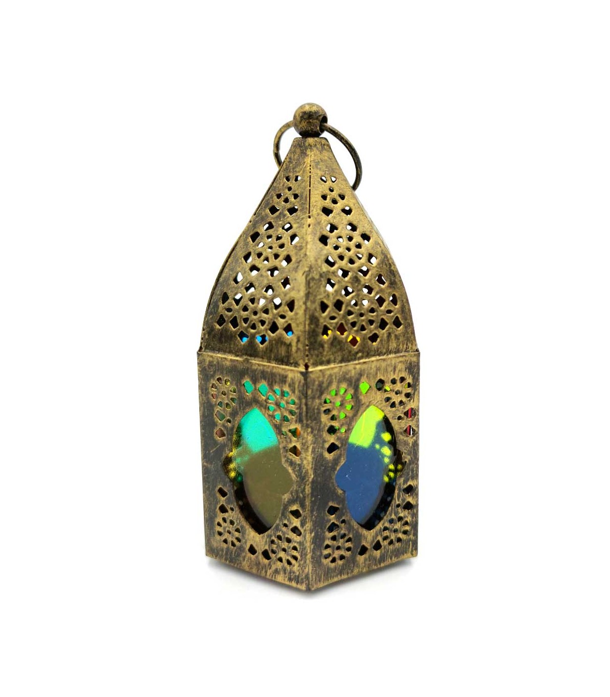 Fügen Sie Ihrem Zuhause mit dieser eleganten, in gealtertem Kupfer geschnitzten arabischen Laterne Eleganz und Wärme hinzu. Seine detaillierten geometrischen Schnitte werfen ein sanftes Licht und schaffen eine...