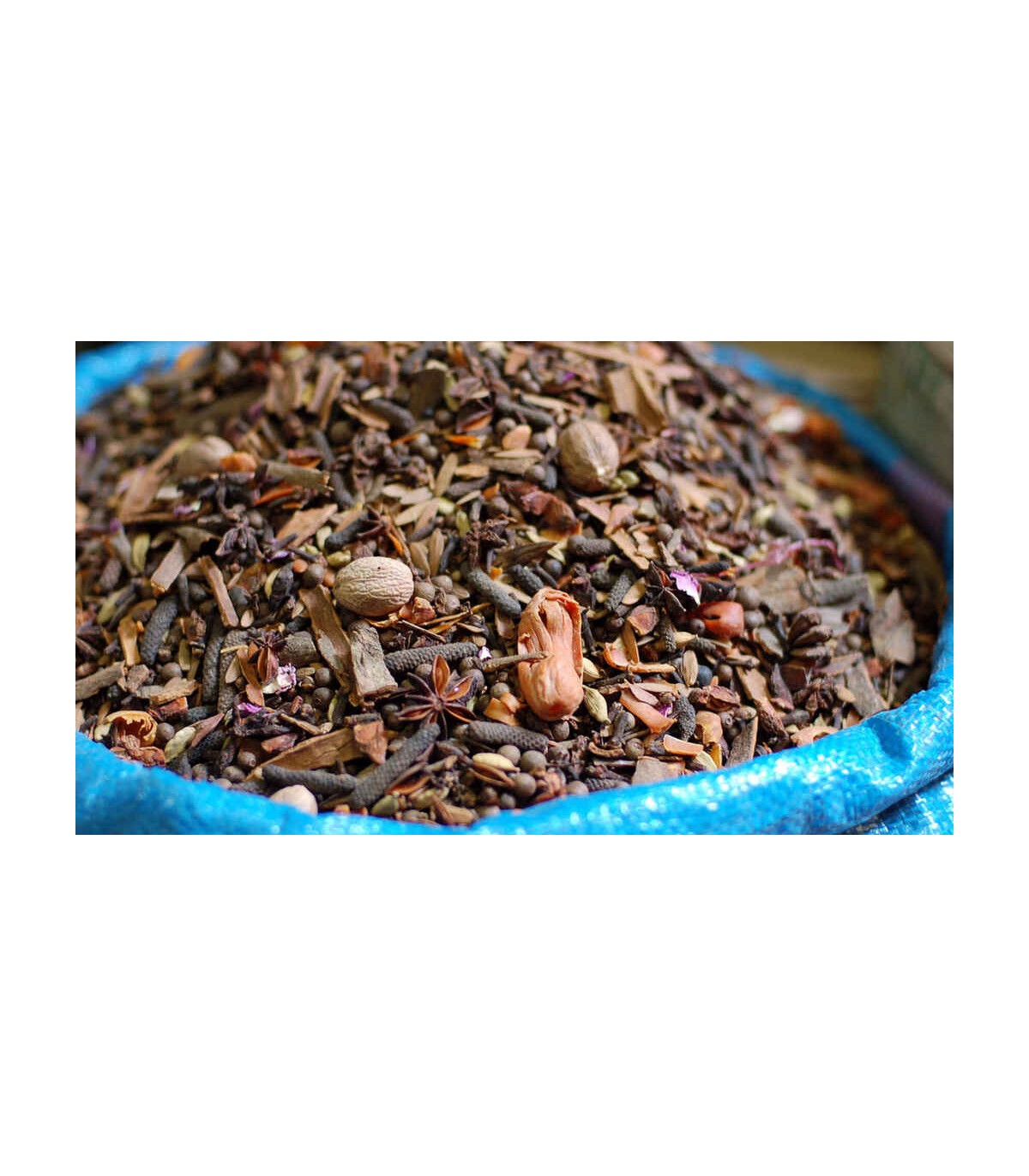 Gewürzmischung, Ras Hanout </ span>Marokkanische Mischung aus aromatischen Kräutern und Gewürzen. Diese Mischung aus Kräutern und Gewürzen ist in der marokkanischen Küche sehr beliebt und der arabische Name bedeutet "das Beste aus dem Laden". Zusammensetzung: Koriander, Kurkuma, Zwiebel, Piment, Zimt, Pfeffer, Knoblauch, Kardamom, Ingwer, Muskatnuss, Paprika, Nelken.