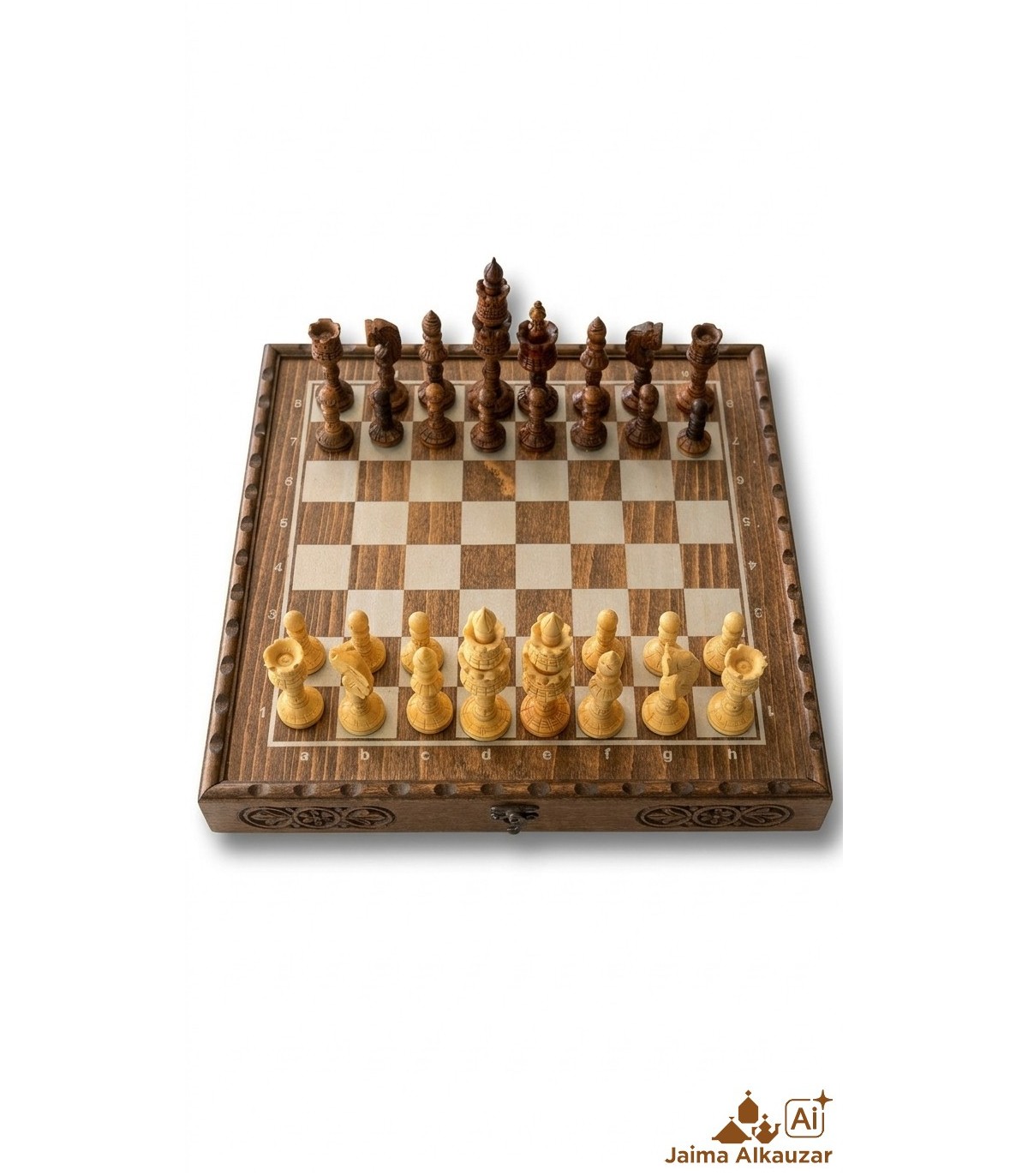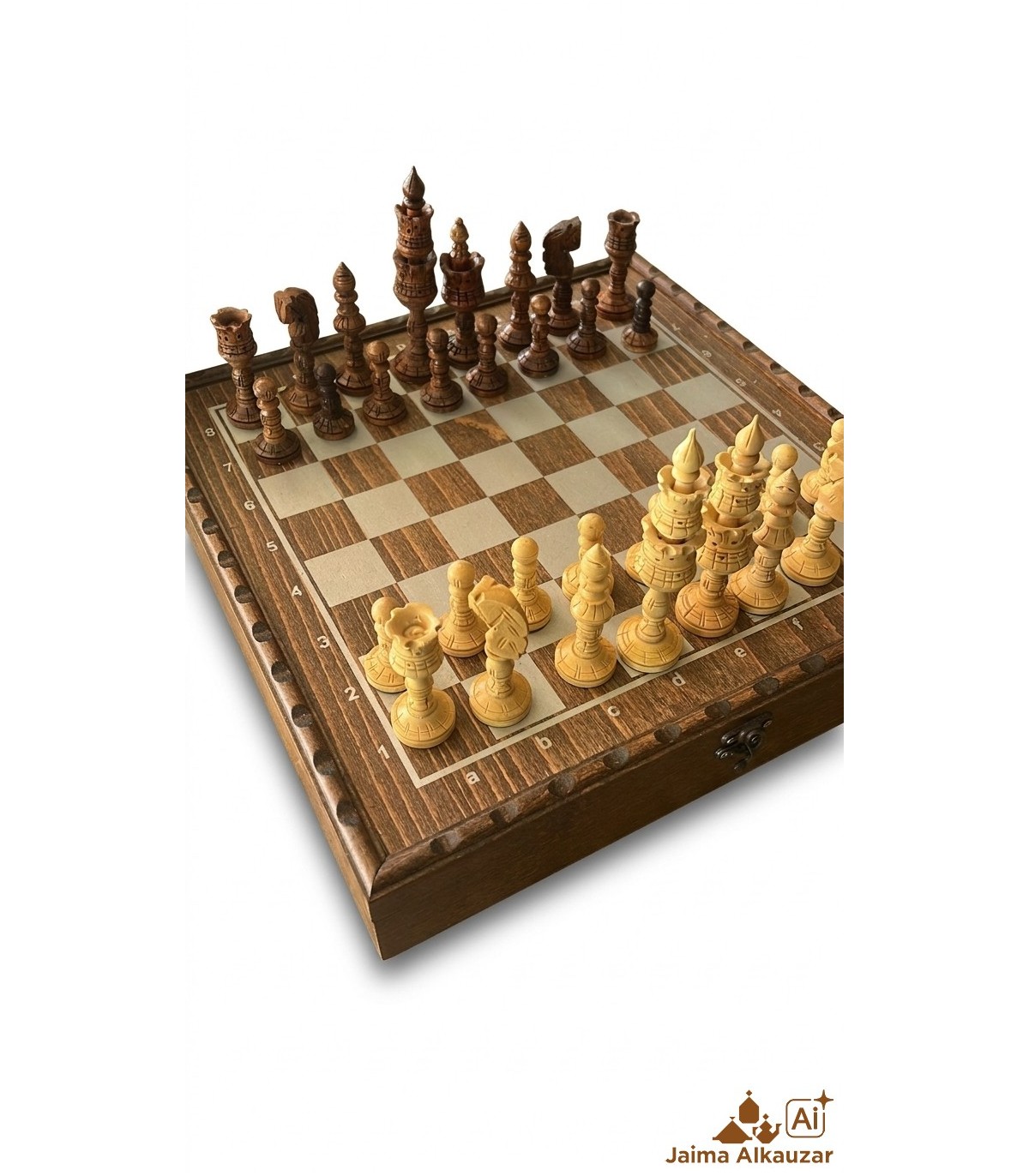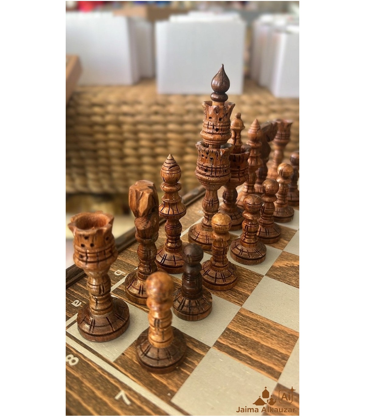Faltschach aus Holz von Hand.Figuren mit sehr vielen Details.Erhältlich in verschiedenen Größen. p>