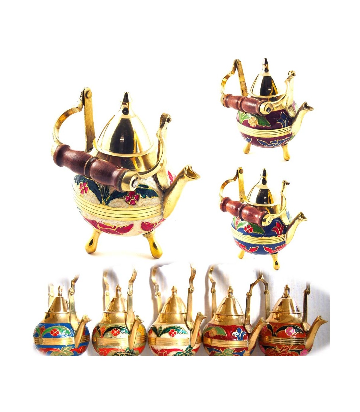 Kleine goldene Teekanne mit Blumenmuster verziert. In fünf Farben erhältlich: blau, grün, weiß, rot und Orange. Es ist eine Miniatur Teekanne, kann verwendet werden, aber es ist eher dekorativ verwenden, die bereits mit einem Fassungsvermögen von etwa 100 ml.