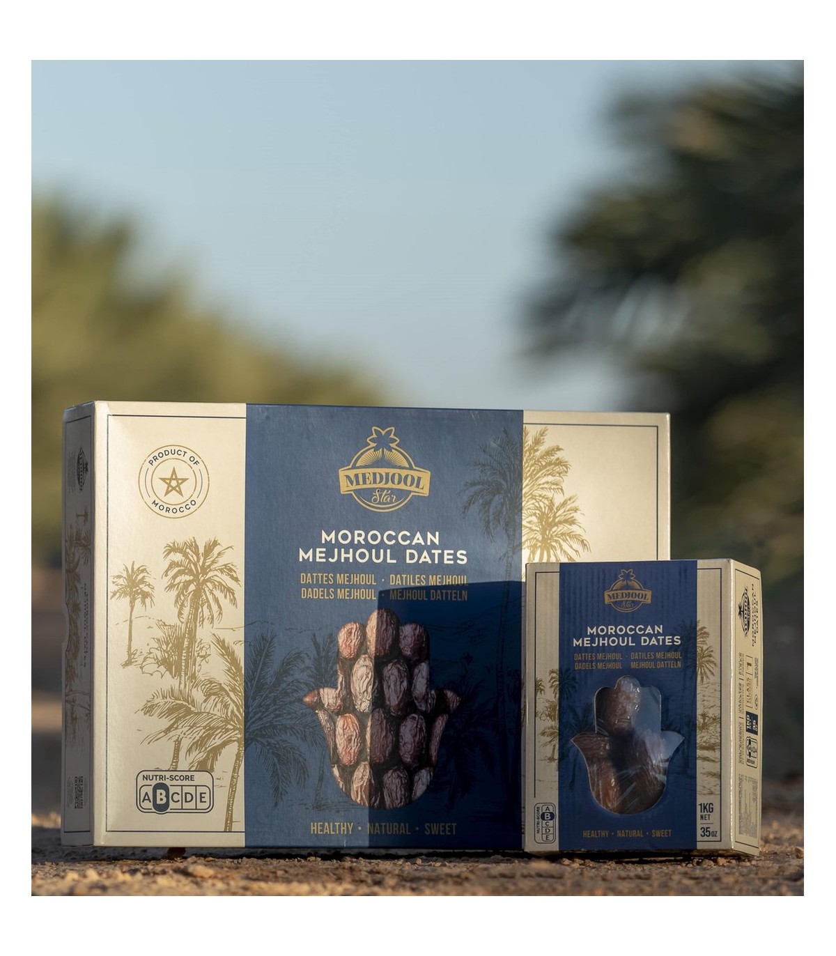 DHochwertige Medjool-Produkte, verpackt in 1-kg-Nettoverpackungen. Produziert und verpackt in Marokko. Reich an Ballaststoffen und Mineralien, mit weicher Textur und süßem Honiggeschmack. 100 % natürlich und ohne Zusatzstoffe. Sie enthalten Knochen!