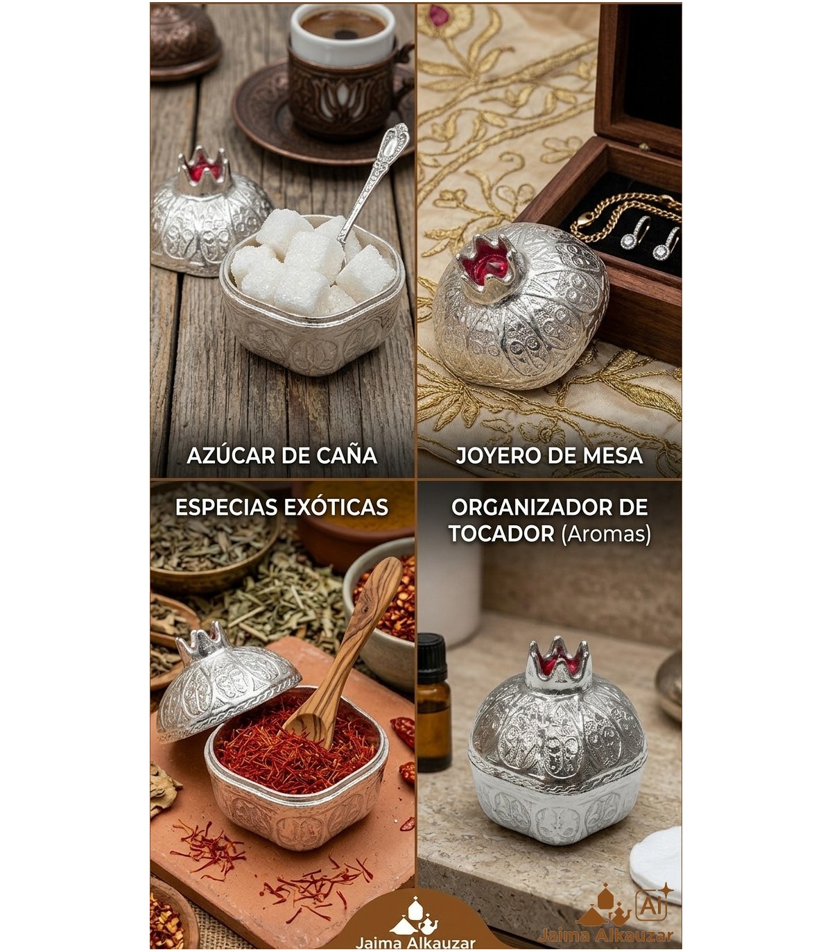 A symbol of abundance and oriental elegance on your table Transform tea or coffee time into an authentic ritual with this spectacular Carved Sugar Bowl with Pomegranate Shape. In many oriental and Mediterranean cultures, the pomegranate is an ancestral symbol of prosperity, abundance, and good luck. This exquisite piece of Turkish craftsmanshipcaptures all that magic in a detailed and elegant design, turning a simple tableware accessory into the center of all eyes and a true jewel for your home.