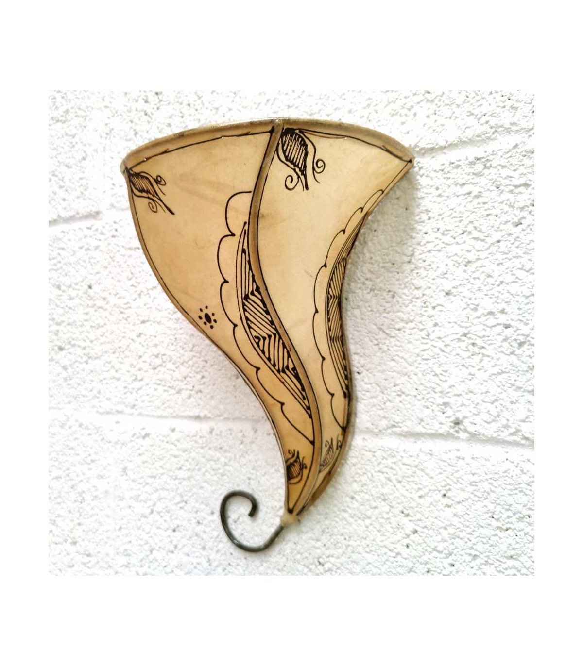 Artisan wall lamp made with a skin base (generally goat) and decorated with ethnic drawings made with henna.