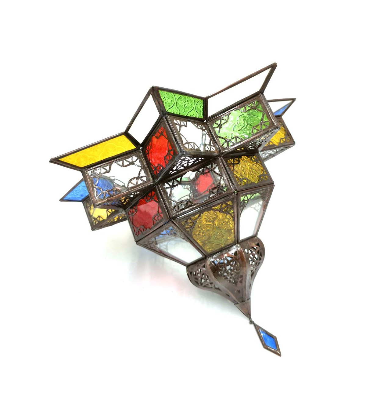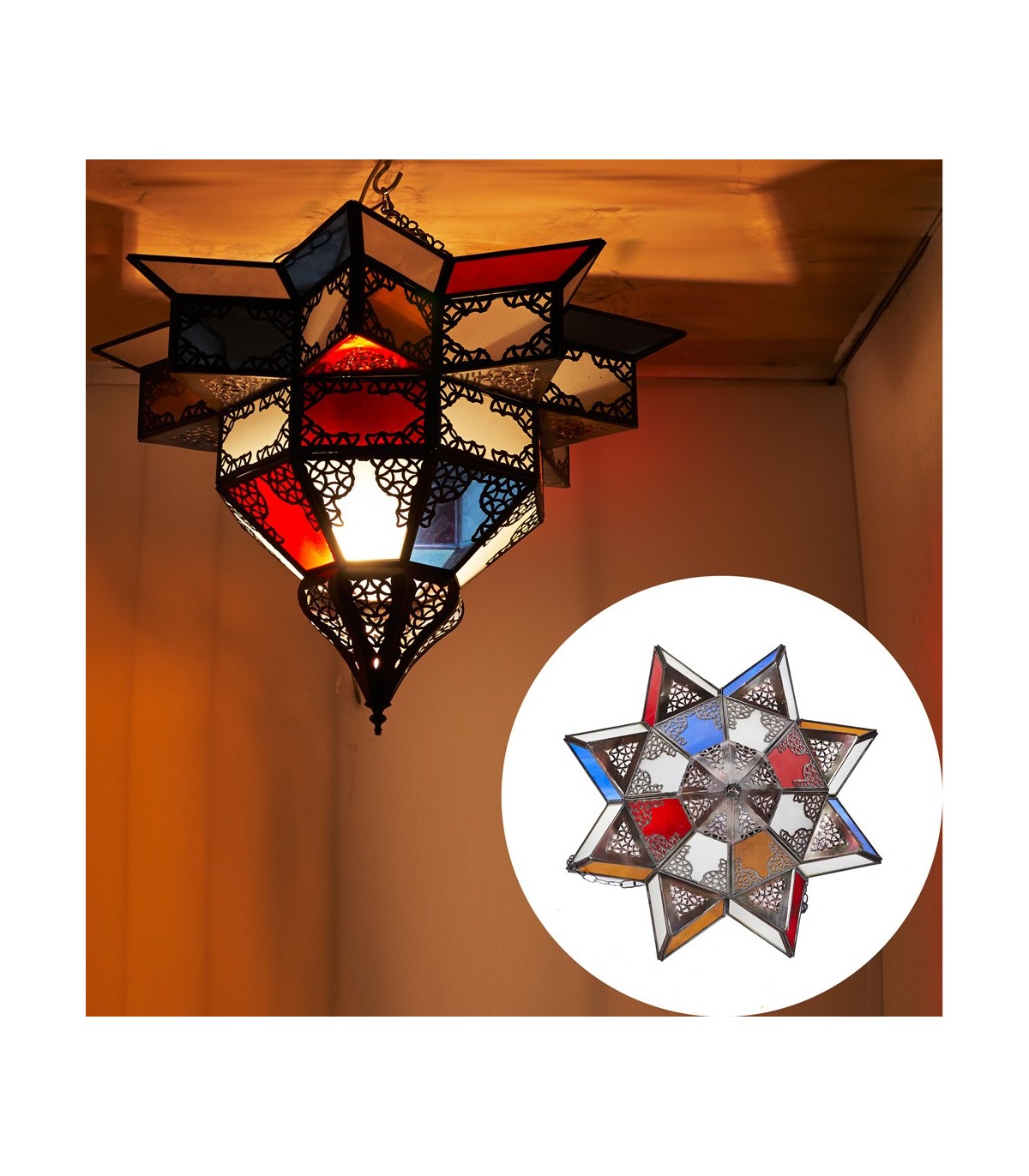 Multicolored Arabic ceiling lamp made by hand and decorated with Arabic motifs. Moroccan handicrafts for the decoration of your home in the Andalusian style. Moh well finished.Colors may vary slightly from the...