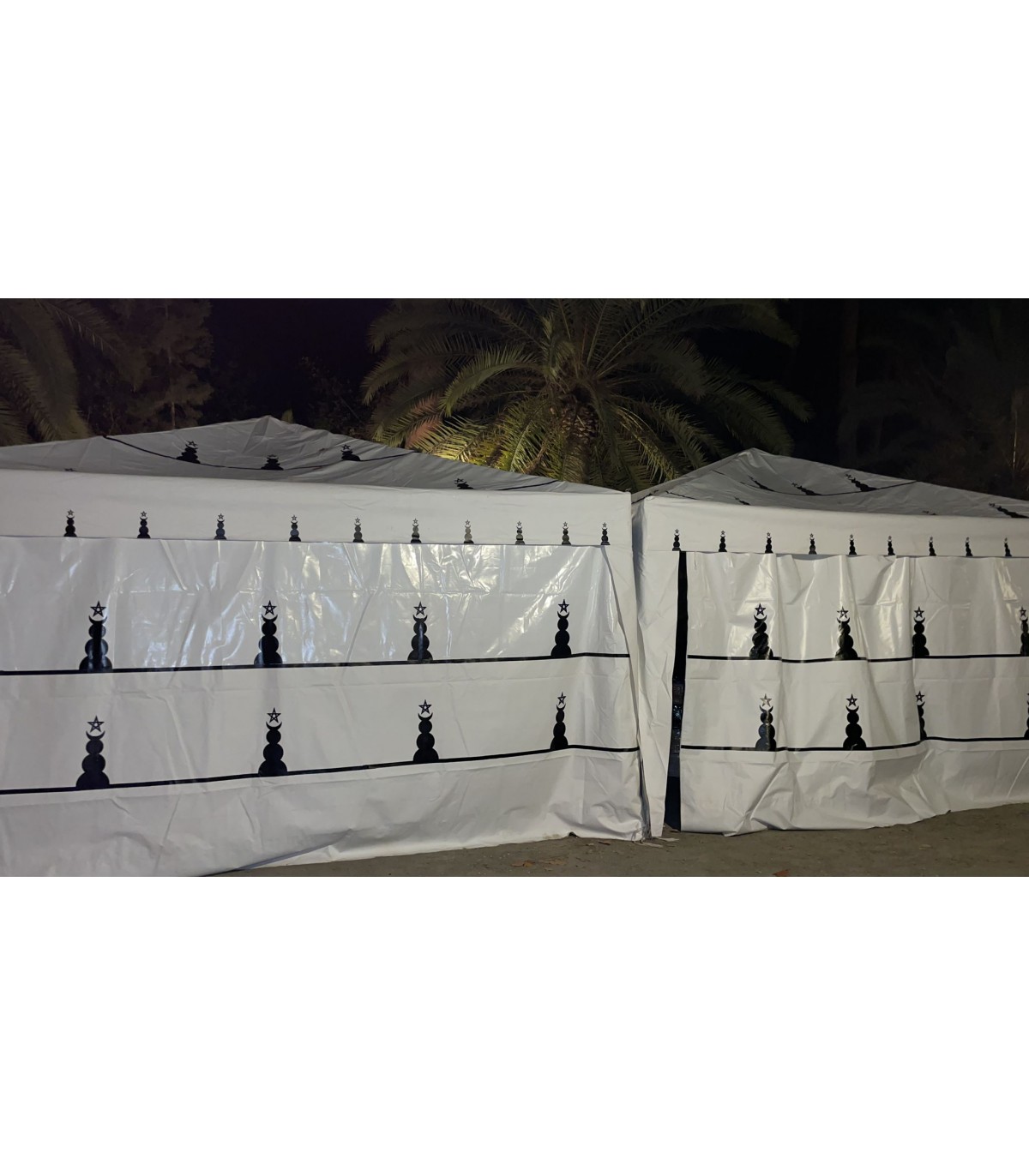 Beautiful rectangular Arab Jaima of 5 x 5 meters made of PVC canvas with an iron structure. Authentic Arabic decoration down to the smallest detail. It has a false ceiling to be more decorative. You can install an Arabic lamp in the center of the ceiling, it has a support for hanging. Ideal for use at parties, events, fairs or birthdays.Recommended for medieval markets. Provides ease of assembly and security for closure.