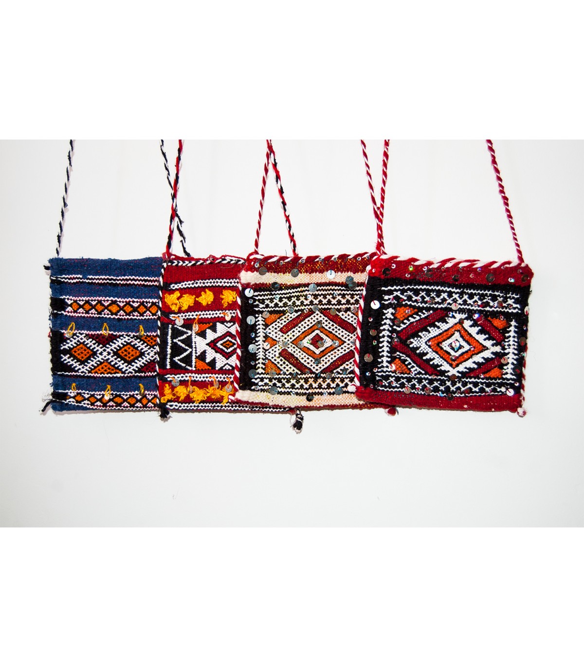 Berber ethnic bagHandmade by authentic artisans in the Rif Mountains of Morocco. Made of wool dyed with natural dyesthrough traditional processes.