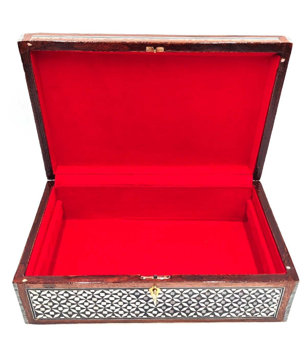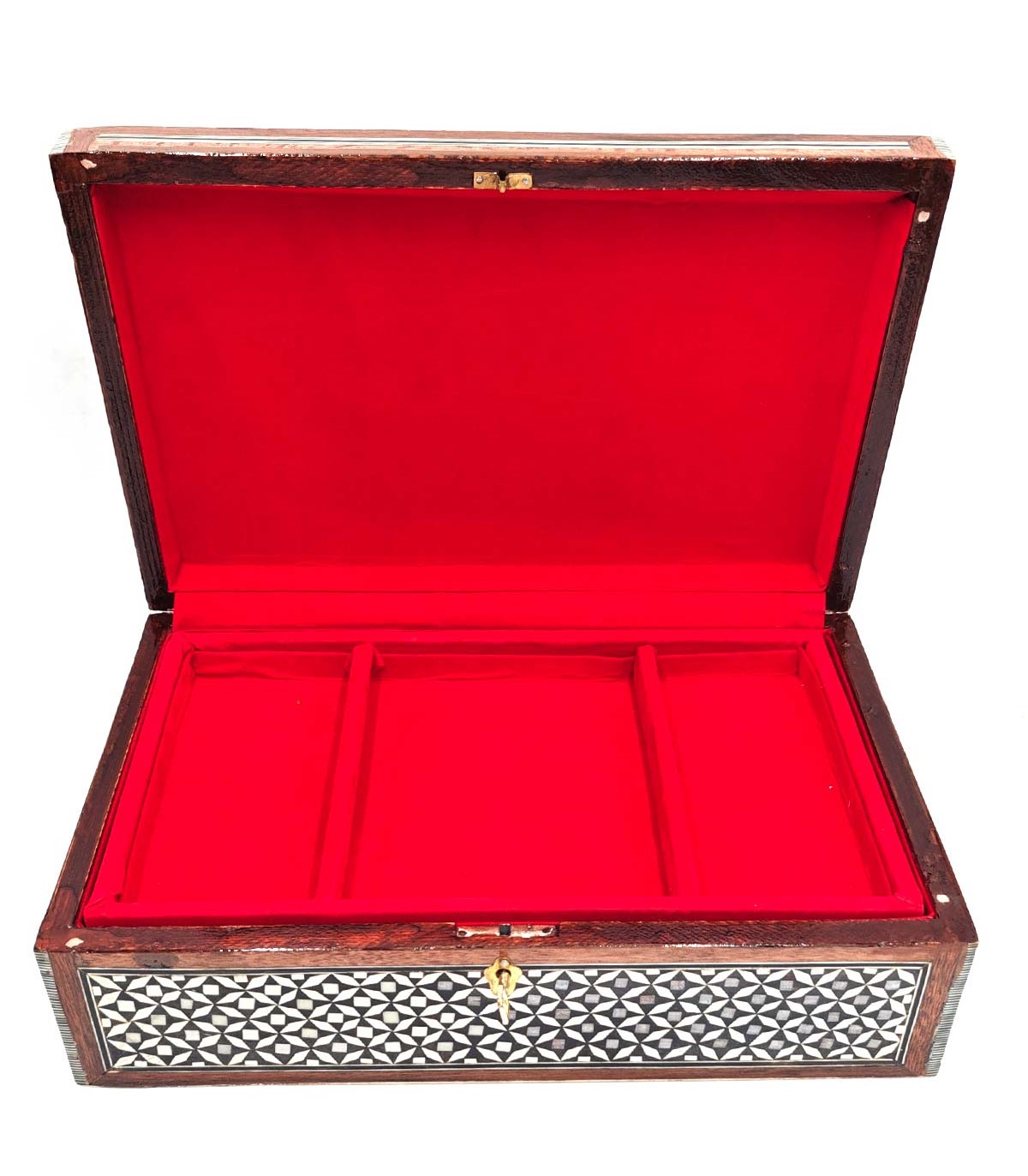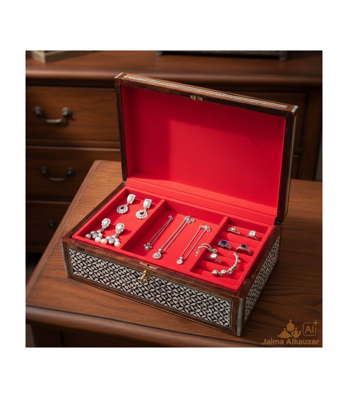 In Jaima Alkauzar, you can buy online the rectangular white taracea jewelry box Egypt at the best price. With wood and mother-of-pearl inlays, and lined inside in red velvet, it is an elegant and sophisticated piece.