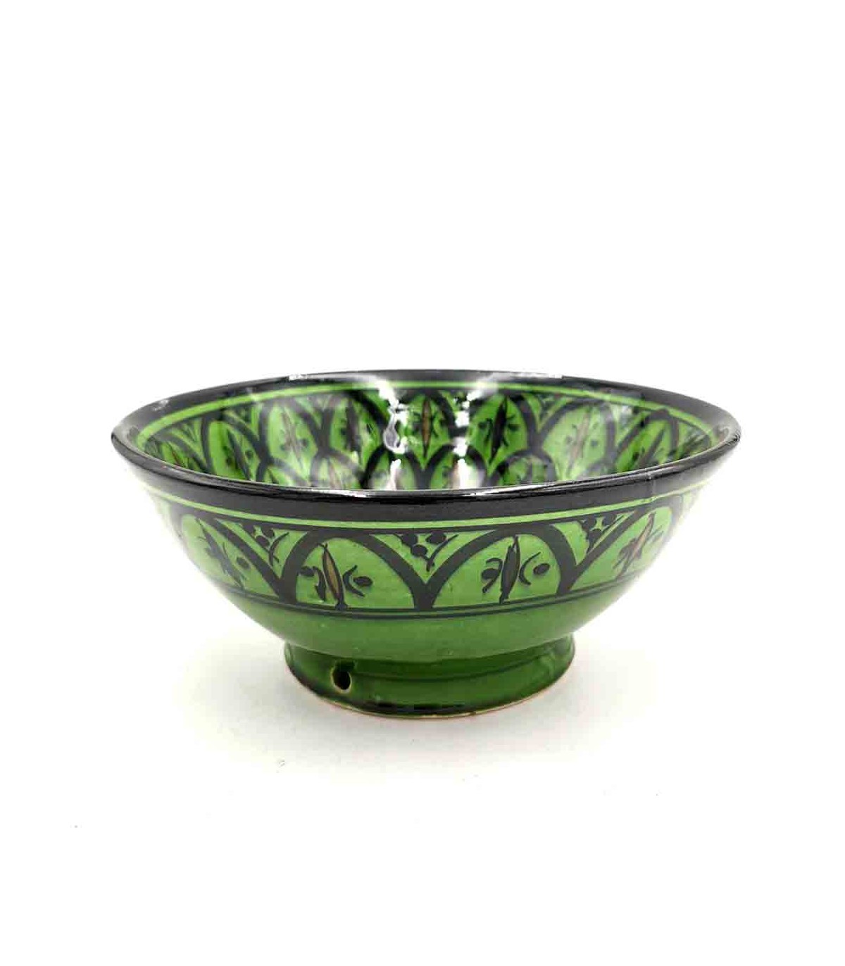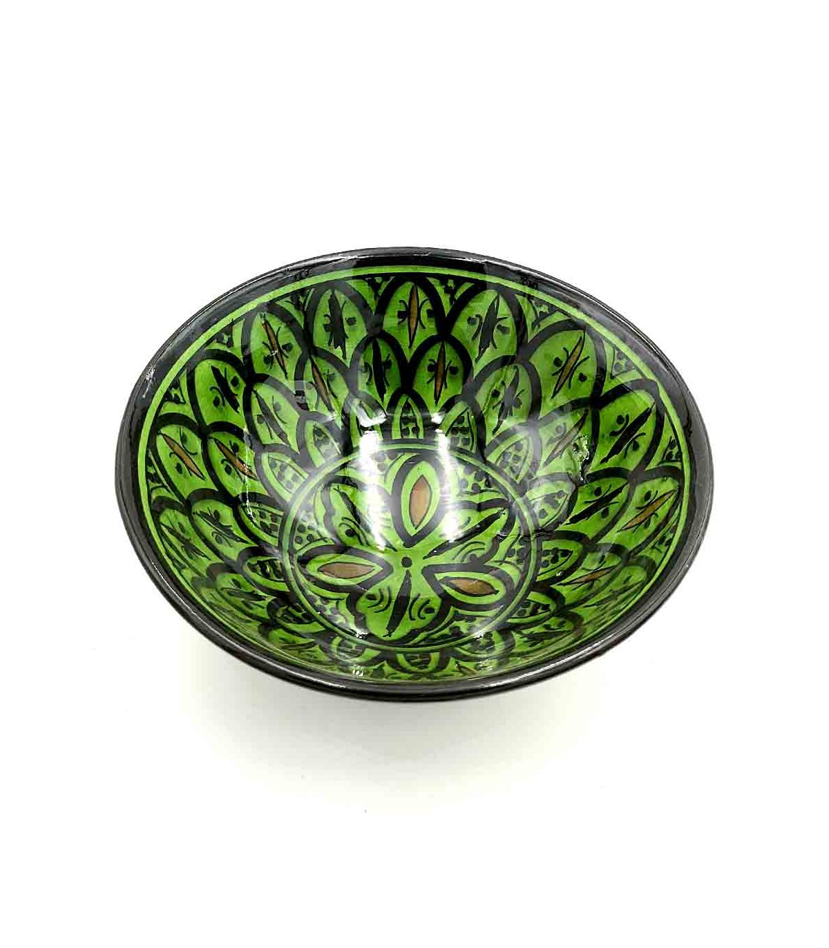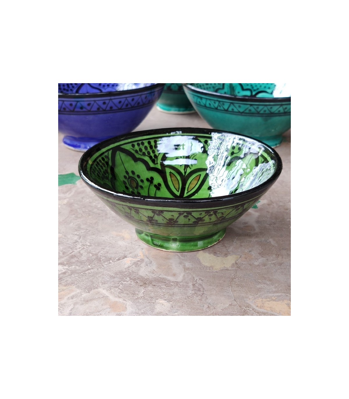 Ceramic bowl from the famous Asfi or Safi city of Morocco. Where they make ceramics in the Andalusian style that is transmitted from master to master, maintaining the technique and colors of ancient Al-Andalus.If you want to decorate your home in an authentic Arabic style, you can use these bowls as spice racks, sauce bowls, for aperitifs... Perfect for decorating your table and for your guests to be truly enchanted by the vivid colors of hand-painted artisan ceramics from Morocco.The size and designs may vary slightly, as it is a handicraft, it always varies a bit, but maintaining the tonality. Available more colors and models click HEREAvailable in several sizes.Size:Size 1 : 8 x 3cm Size 2 : 12 x 4.5cm Size 3 : 16 x 7cm Size 4 : 21 x 8.5cm