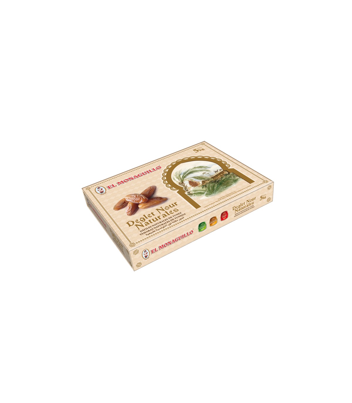 The Deglet NourIt is the queen variety in the Tunisian Sahara and emblem of the nutritional diet of the Berber people. The macro-climatic conditions of the Tunisian oasis, which allow the exquisite combination of a dry tropical sun on the tops of the date palm, along with fresh and pure water from which its roots drink, produce a fruit with a unique flavor and supreme quality. Date Deglet Nour Natural (standard)loose from the branches once selected, according to its caliber and texture. Conservation:12 months. Temperature from 0º C to 4º C and 70% HR Weight:5KG