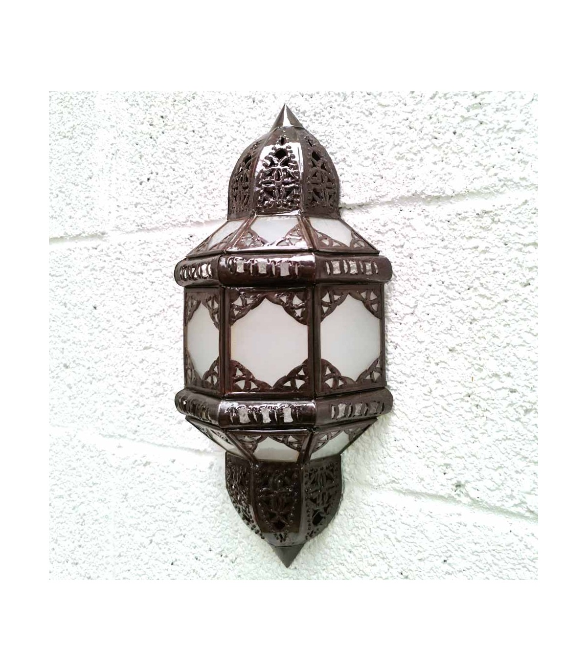 Moroccan wall lamp Andalusian style decorated with openwork sheet metal and translucent white glass, handcrafted in Morocco.