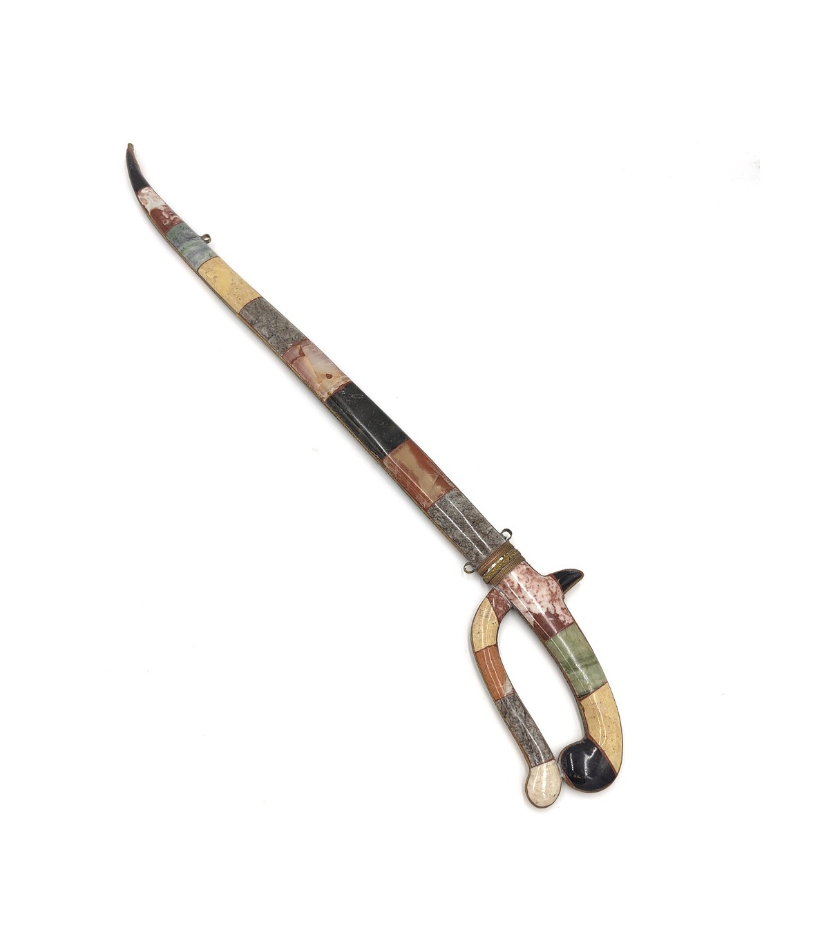 Moroccan Saber made by hand with minerals and fossils, this Arabian saber-style sword is decorative. It has some supports to be able to hang it as a decoration in any room of your home giving a very original Andalusian touch.