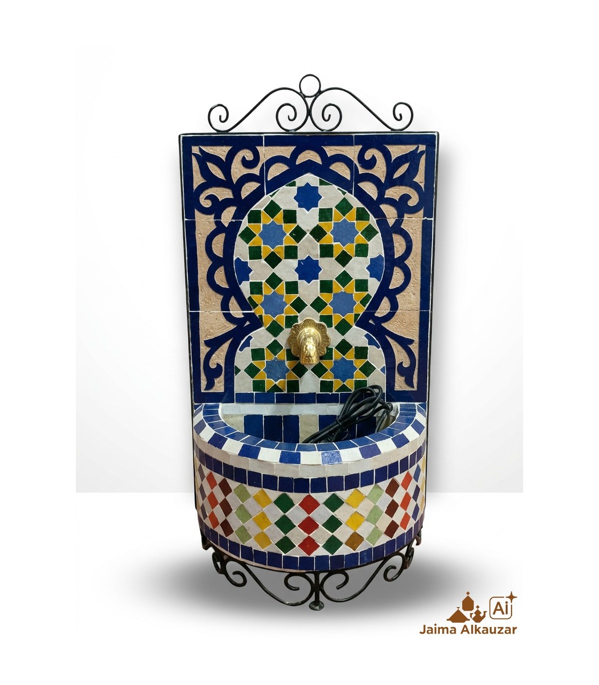 Discover the authentic beauty of Moroccan Zellige tiles, handcrafted in Fez. Our handcrafted mosaic fountain is a masterpiece of tradition and craftsmanship, perfect for decorating your spaces with vibrant colors and unique designs.>