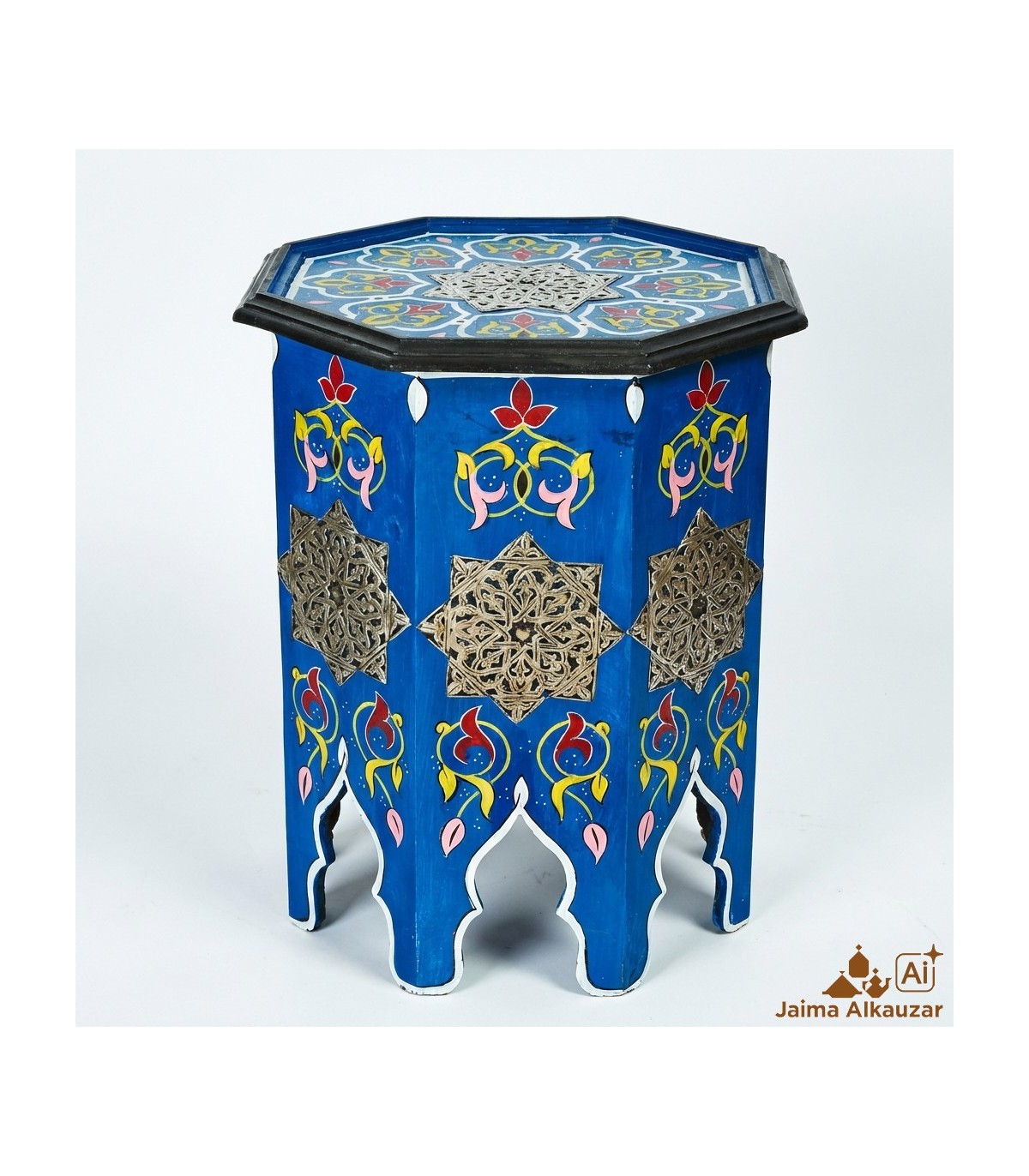Andalusian octagonal bedside table painted by hand. Made of wood and decorated with alpaca. High quality product very well finished. Ideal for decorations and Arab environments. Available in various colors. Handcrafted.