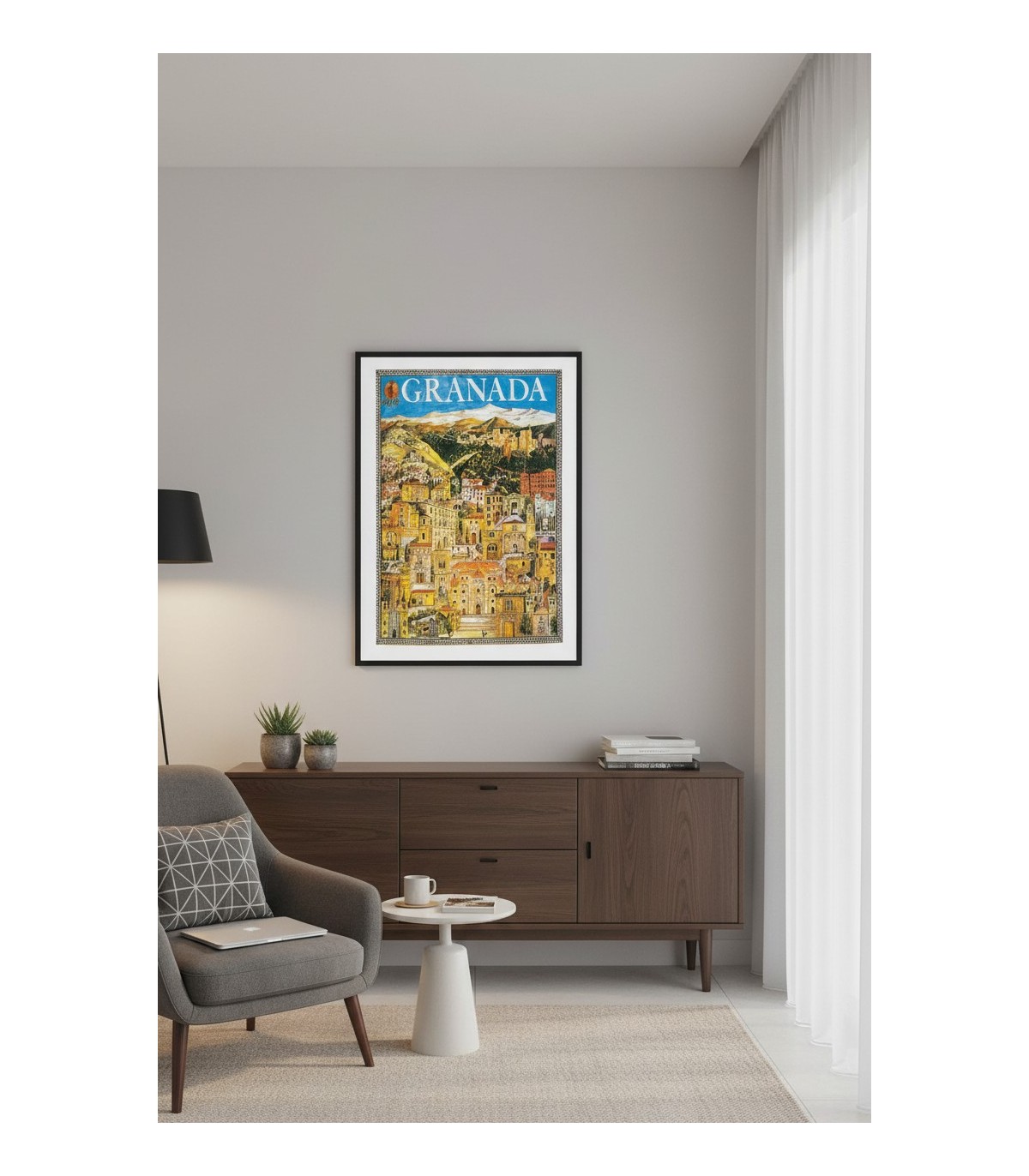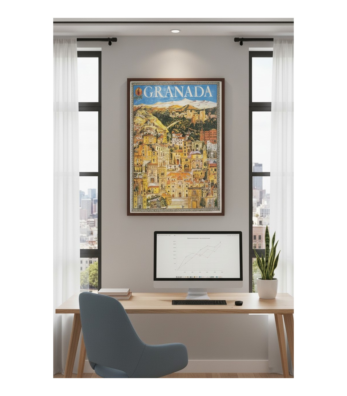 Every detail has been carefully painted by a local artist, conveying the light, color and atmosphere that make Granada one of the most beautiful cities in the world. Printed on high resolution on high quality artistic paper, this poster is available in two formats —70×100 cm and 45×70 cm— para adaptarse a todo tipo de espacios, desde hogares hasta oficinas, hoteles o alojamientos turísticos.