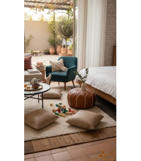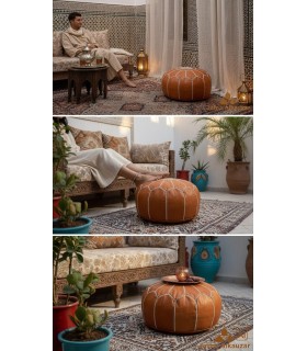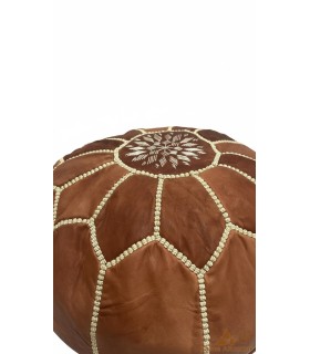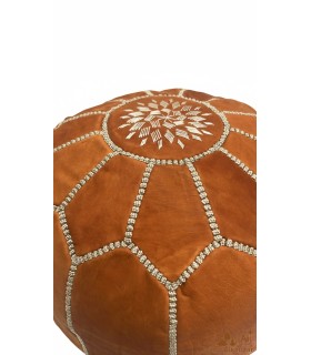 Handmade leather pouf made in Morocco with cowhide. Decorated with embroidery. Yiibili model.Includes special high-density filling. Which maintains the shape of the pouf and is comfortable to use.