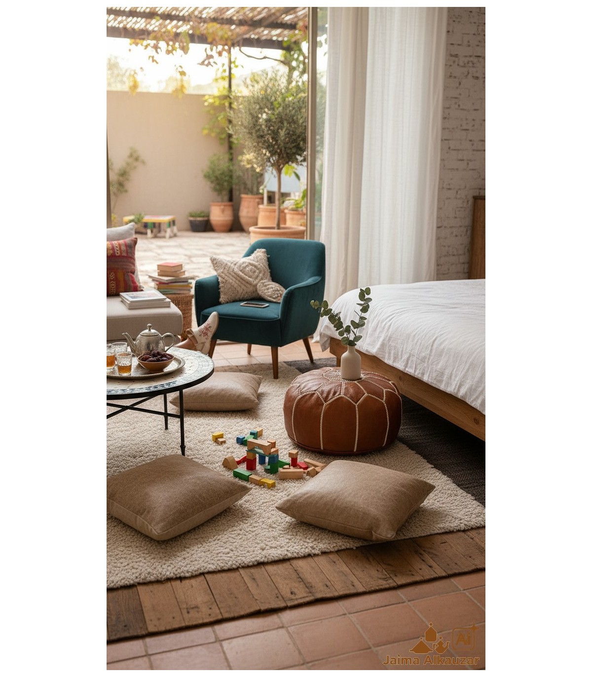 Moroccan puff, Andalusian Arabic style, handcrafted in leather. Made in Morocco by hand decorated with colored mosaic and decorated with golden motifs. Ideal for decoration in the style of the thousand and one nights....