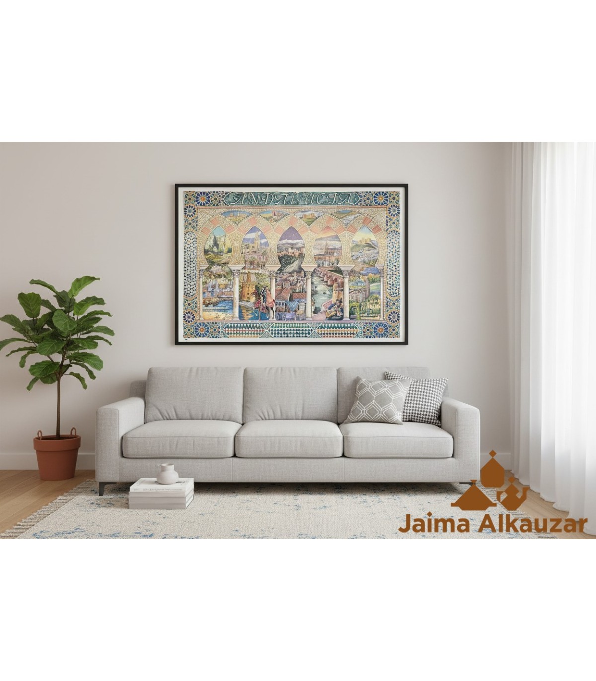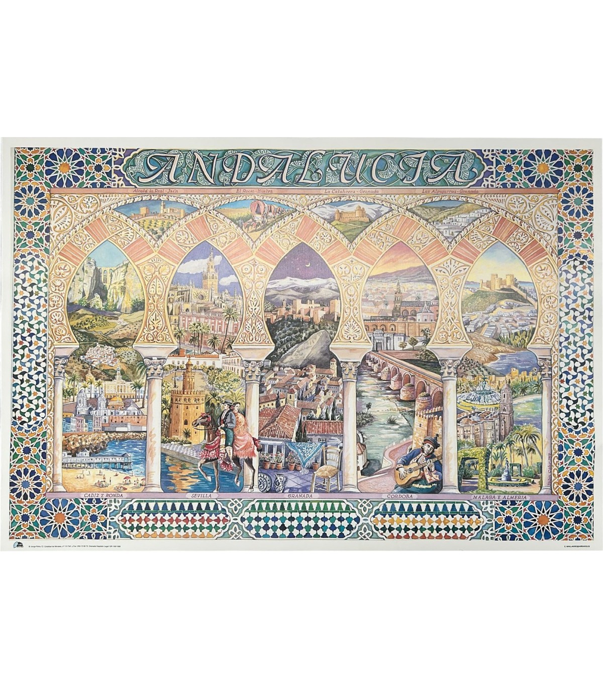 Artistic poster of Andalusia and its provinces of Arab origin, painted freehand in watercolor. It represents monuments and landscapes of Granada, Cordoba, Seville, Malaga, Almeria and Cadiz. Available in 70×100 cm and 45×70 cm.