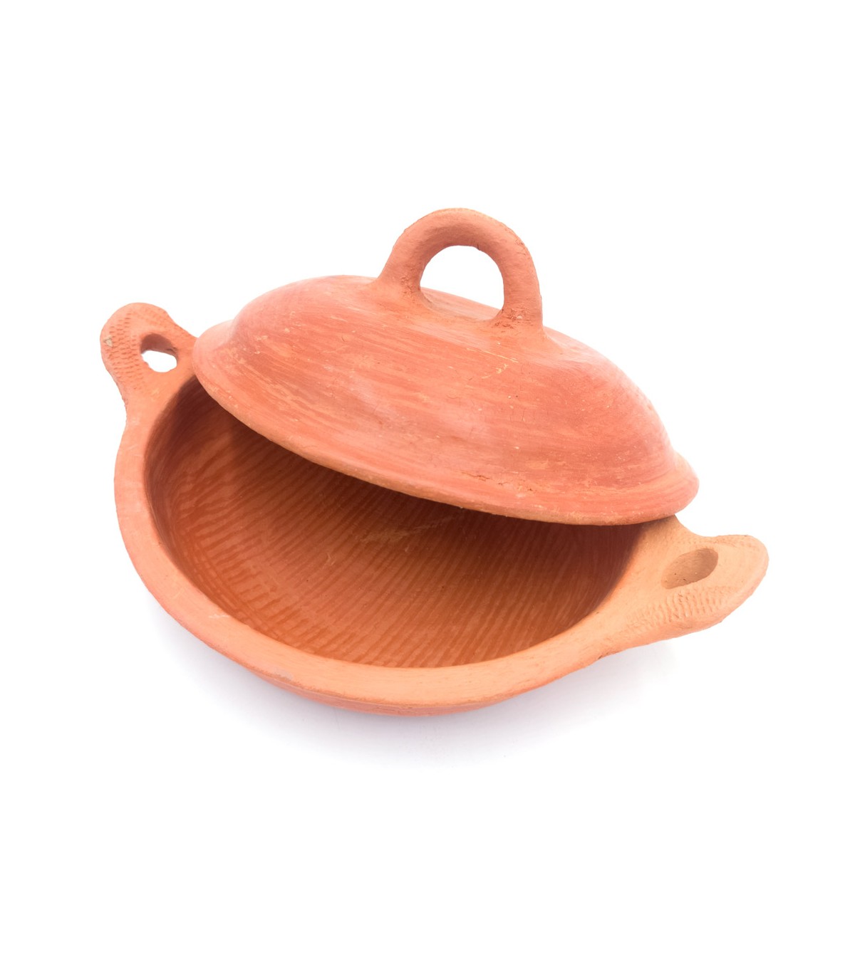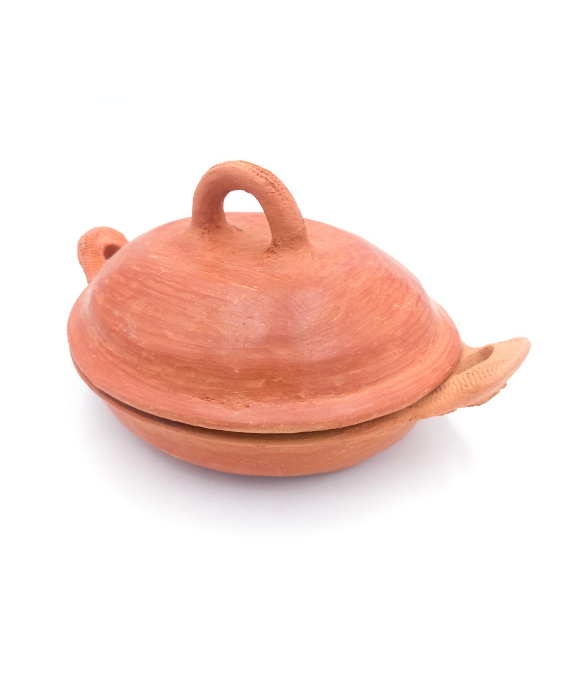 Oval clay tajin from Morocco, handcrafted by heritage master craftsmen. Ideal for use directly on a wood or gas fire. Not suitable for any other type of kitchen due to its irregular shape.In this very special ceramic, traditional methods and materials are used without adding chemicals. The red colored clay is selected with the help of a sieve and shaped into a stone-dish making a simple decoration. Subsequently, it is dried and placed in a traditional wood-fired oven. This is how noodles, plates, pots, bowls and some kitchen utensils are made. The Ministry of Handicrafts has granted the Oued Laou Ceramics the quality seal of designation of origin.Size:35cm width x 24cm diameter x 6cm height.