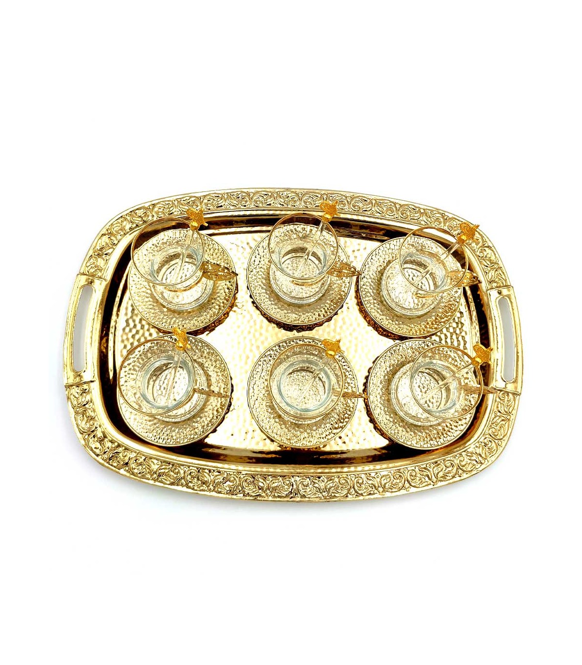 Set Set of 6 Turkish glasses with golden metal decorations, metal saucers, Golden tray included and 6 glass spoons. Ideal for Turkish decoration, great elegance. The perfect gift for any occasion.