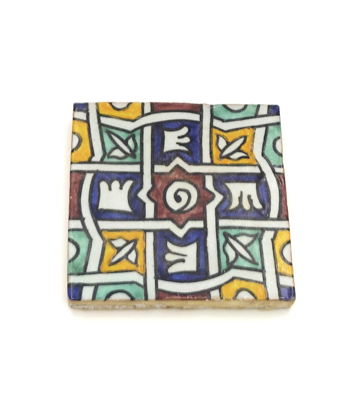 Andalusian tile made by hand with Arabic motifs. Ideal for flooring, as a decorative piece, to create a mosaic, border, etc.Measures:10 x 10 cm Thickness: 15 mm +/-