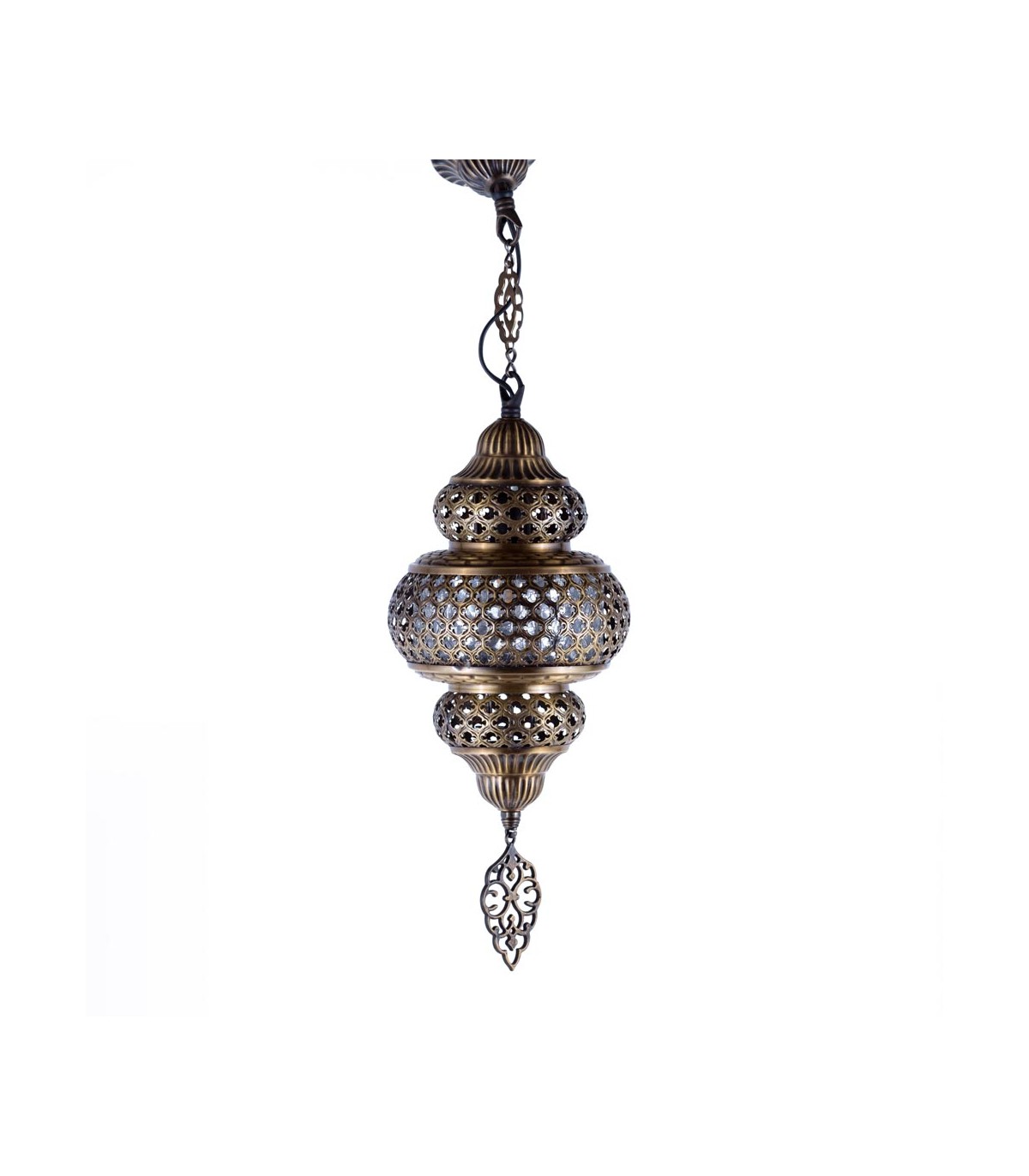 Turkish ceiling or pendant lamp made with metal and glass, using the cracked metal technique. It can be hung on the ceiling or wall with an adapter. In jaimaAlkauzar you can purchase the supportref="https://jaimaalkauzar.es/en/arabic-lamps/5720-support-or-wall-hook-to-hang-lamps-snail-model-22cm-.html">here.Thanks to the carved mosaics, it will emit a unique light that will create a magical and relaxing atmosphere wherever it is placed.