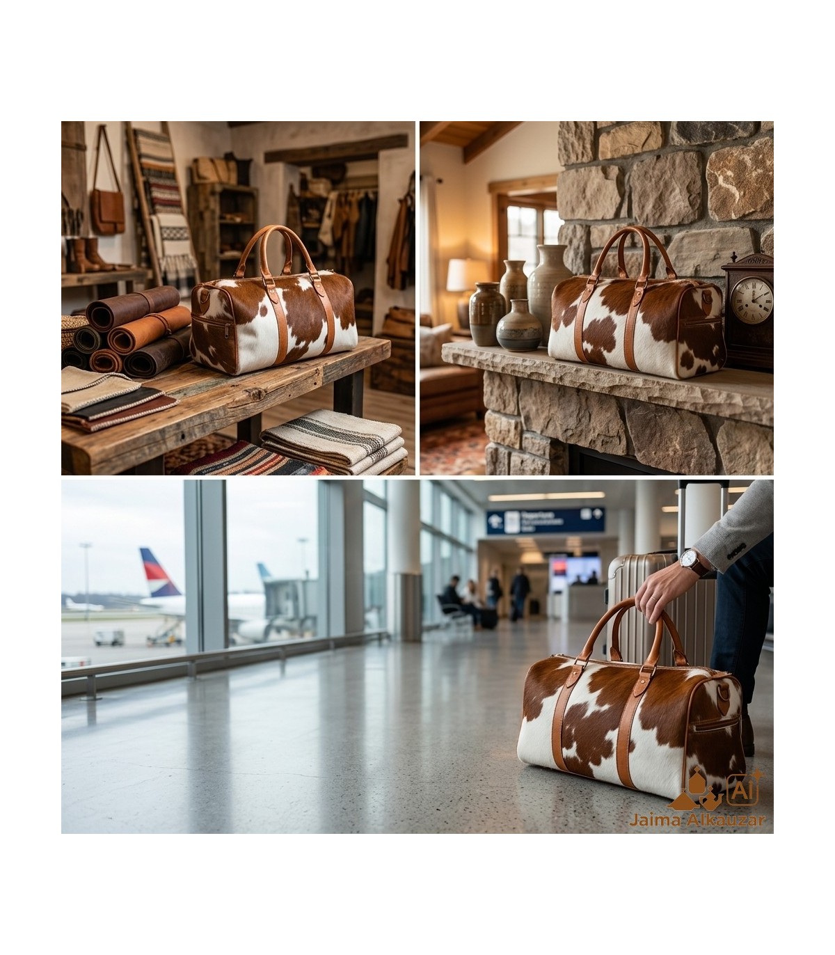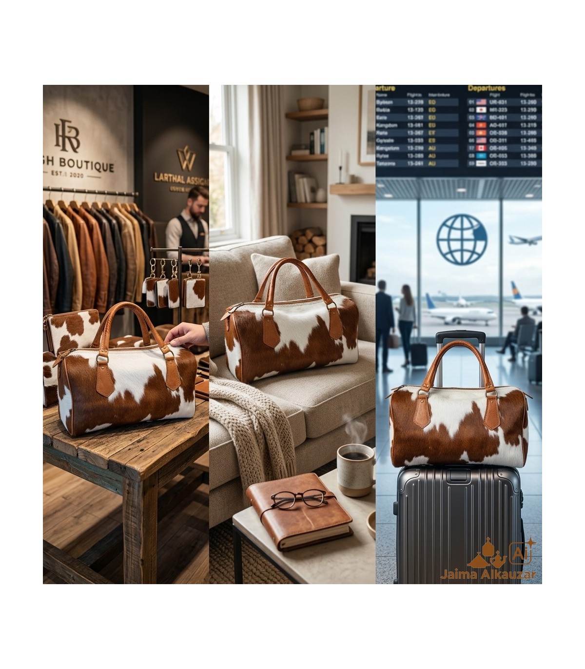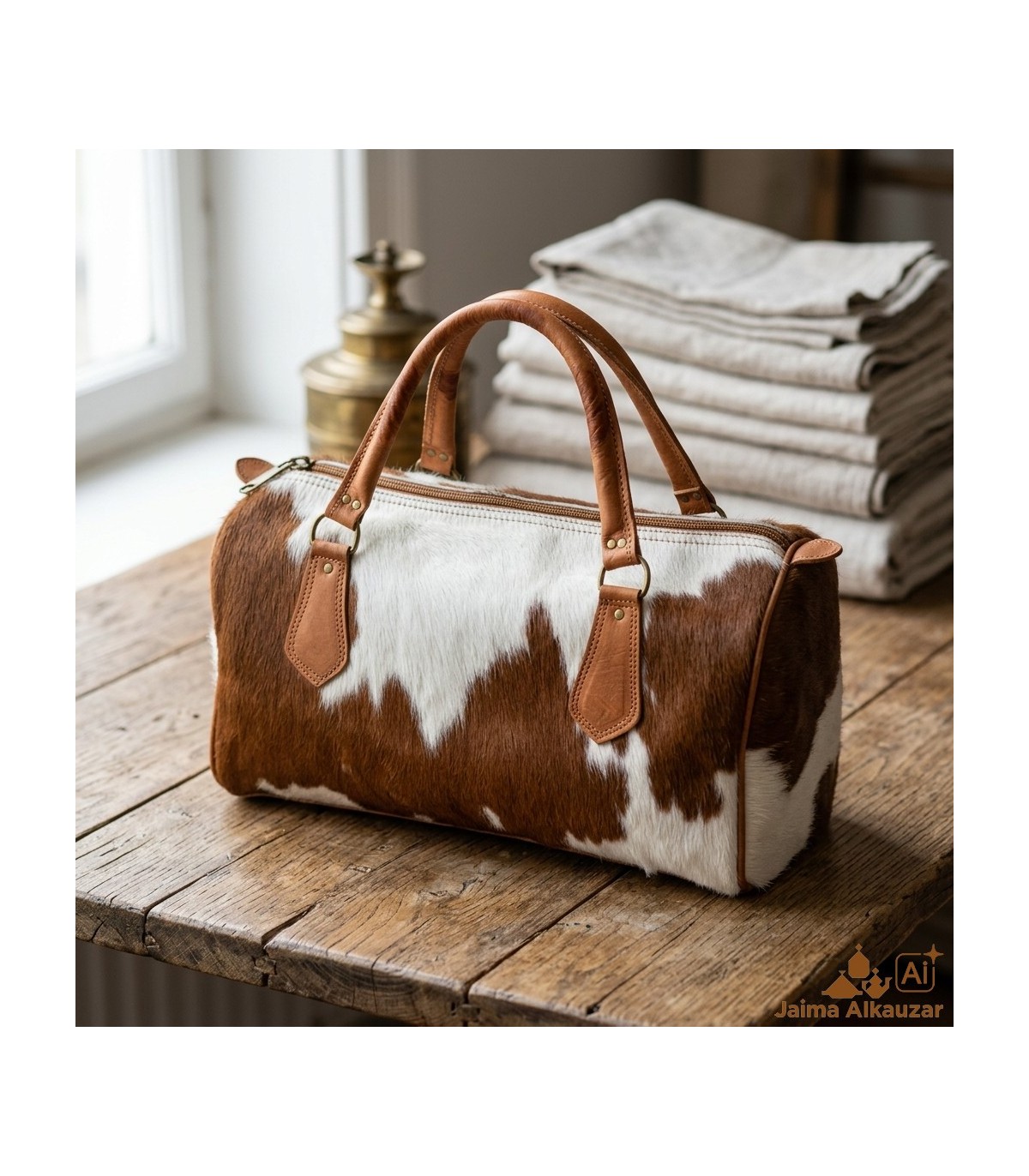 Bolso de viaje artesanal marroquí en piel de vacuno con pelo natural intacto. Elegante, espacioso y único, ideal para quienes buscan estilo y autenticidad en un producto exclusivo.