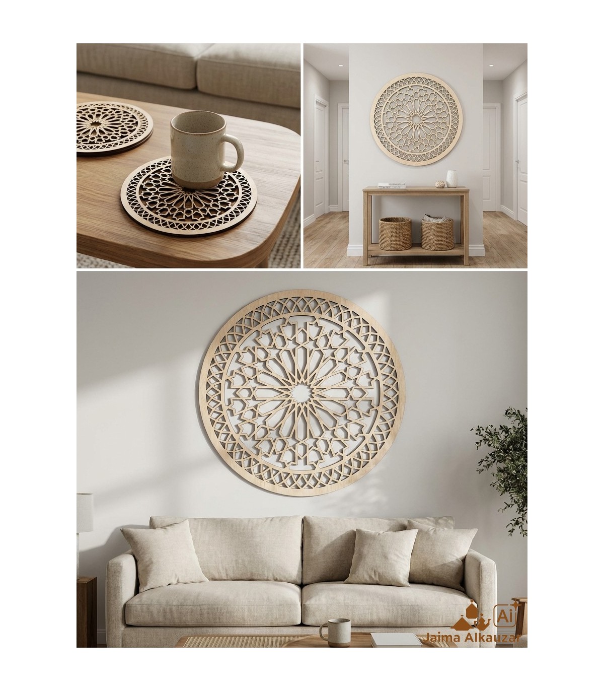 Transforma tu espacio con este exclusivo cuadro decorativo de celosía árabe, fabricado en madera y con corte láser de alta precisión. El Modelo Dawar ofrece un diseño intrincado y elegante que refleja la rica tradición de la decoración oriental y andaluza, añadiendo un toque sofisticado a cualquier ambiente. Su estilo único y detalles minuciosos lo convierten en la opción perfecta para realzar el estilo de tu hogar. Ideal para colocar en el salón, comedor o pasillo, este elemento decorativo creará un ambiente cálido y exótico en tu hogar.