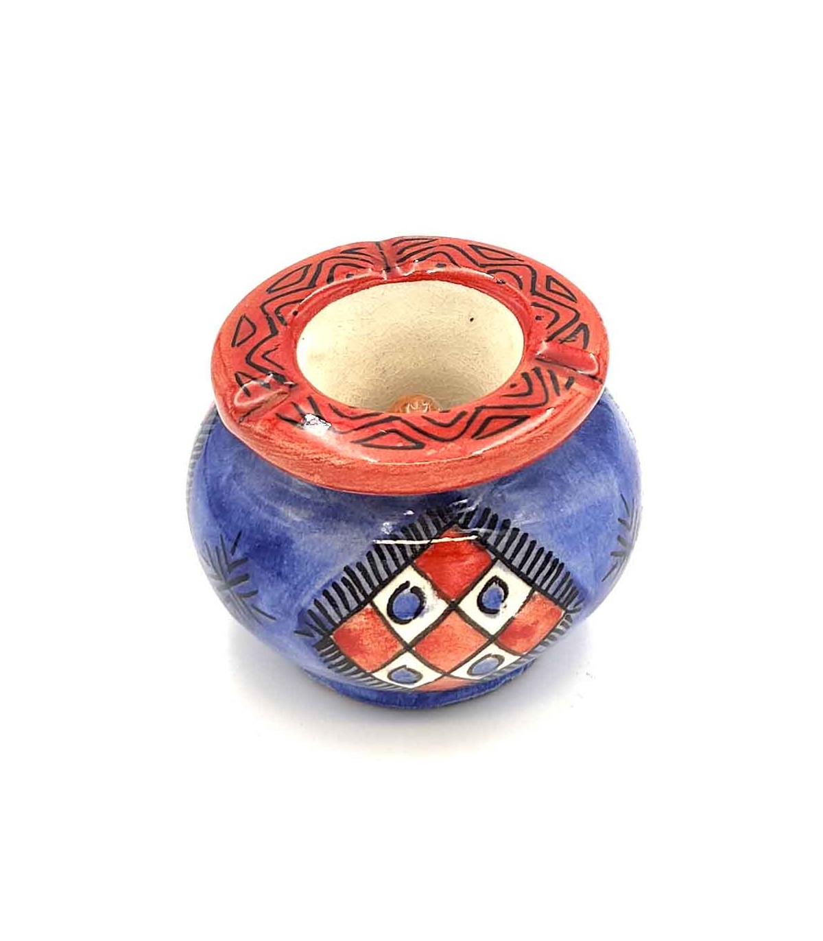 Cenicero de agua de cerámica esmaltada pintada a mano con diseños geométricos. Artesanía marroquí. Realizado artesanalmente. Unidades limitadas. Antiolores de tabaco.