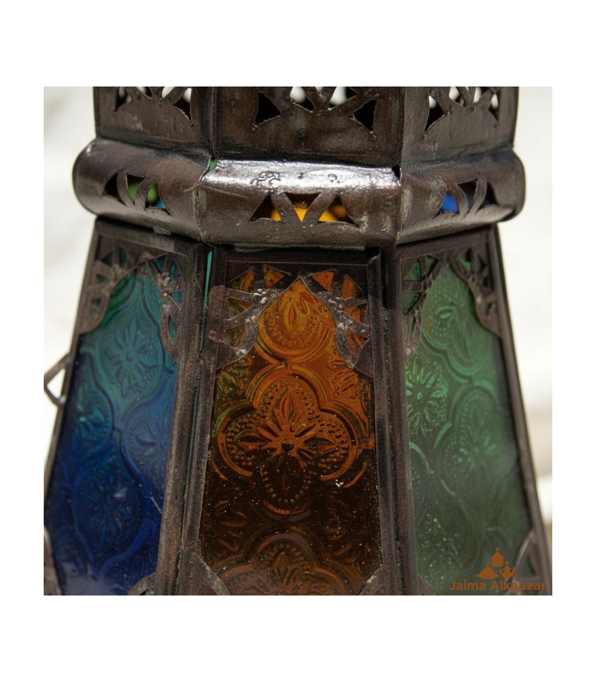 Farol portavelas de metal con diseños geométricos inspirados en Al Andalus. Para darle un toque a su decoración con detalles andalusíes, quedara maravilla con el reflejo de las celosias moriscas. Creara un ambiente...