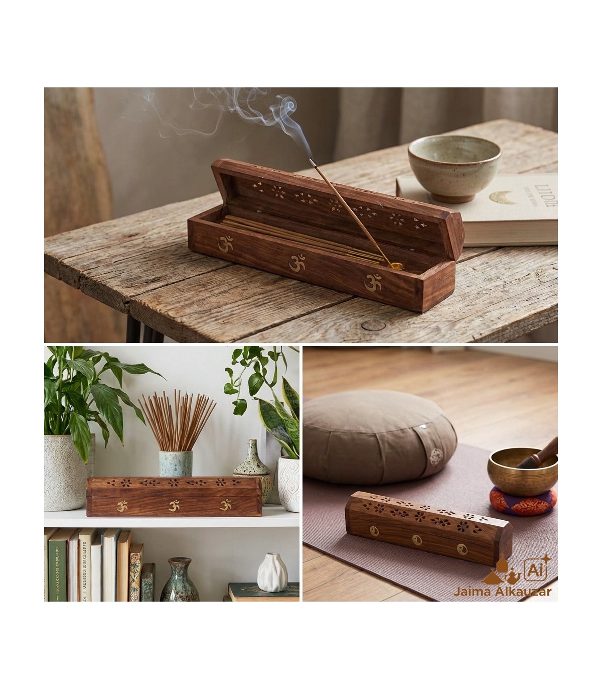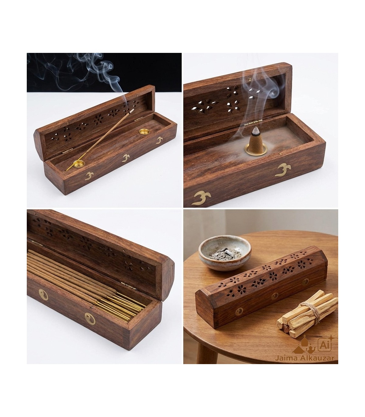 Incensario de madera para conos y varillas. Dispone de cajón para guardar el incienso. Muy bonitos.