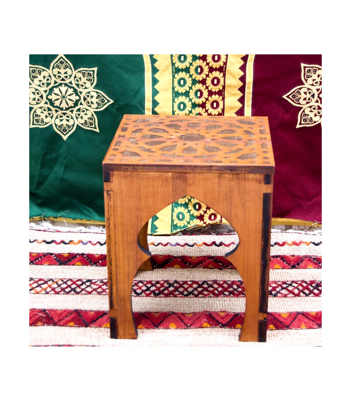 Mesita o taburete de madera PARA DECORACIÓN ÁRABE, realizado artesanalmente, decorada con motivos inspirados en la Alhambra, diseños geométricos, grabados en la madera, con máquinaler, lo que proporciona exactitud en los grabados que realizamos. Disponible en varios colores.