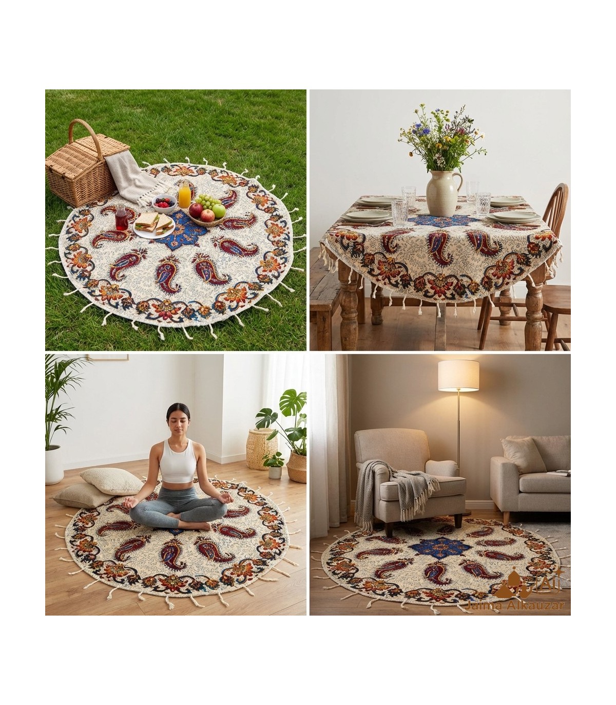 Descubre la belleza de la artesanía tradicional con nuestro tapete redondo de algodón artesanal de 150 cm de diámetro, hecho a mano en Oriente Medio. Elaborado con tintes vegetales naturales y técnicas ancestrales, cada tapete es una pieza única que combina sostenibilidad con elegancia.