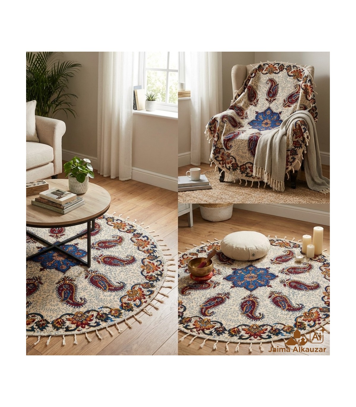 Tapete Redondo de Algodón Artesanal 150 cm - Hecho a Mano con Tintes Vegetales y Motivos Florales Únicos