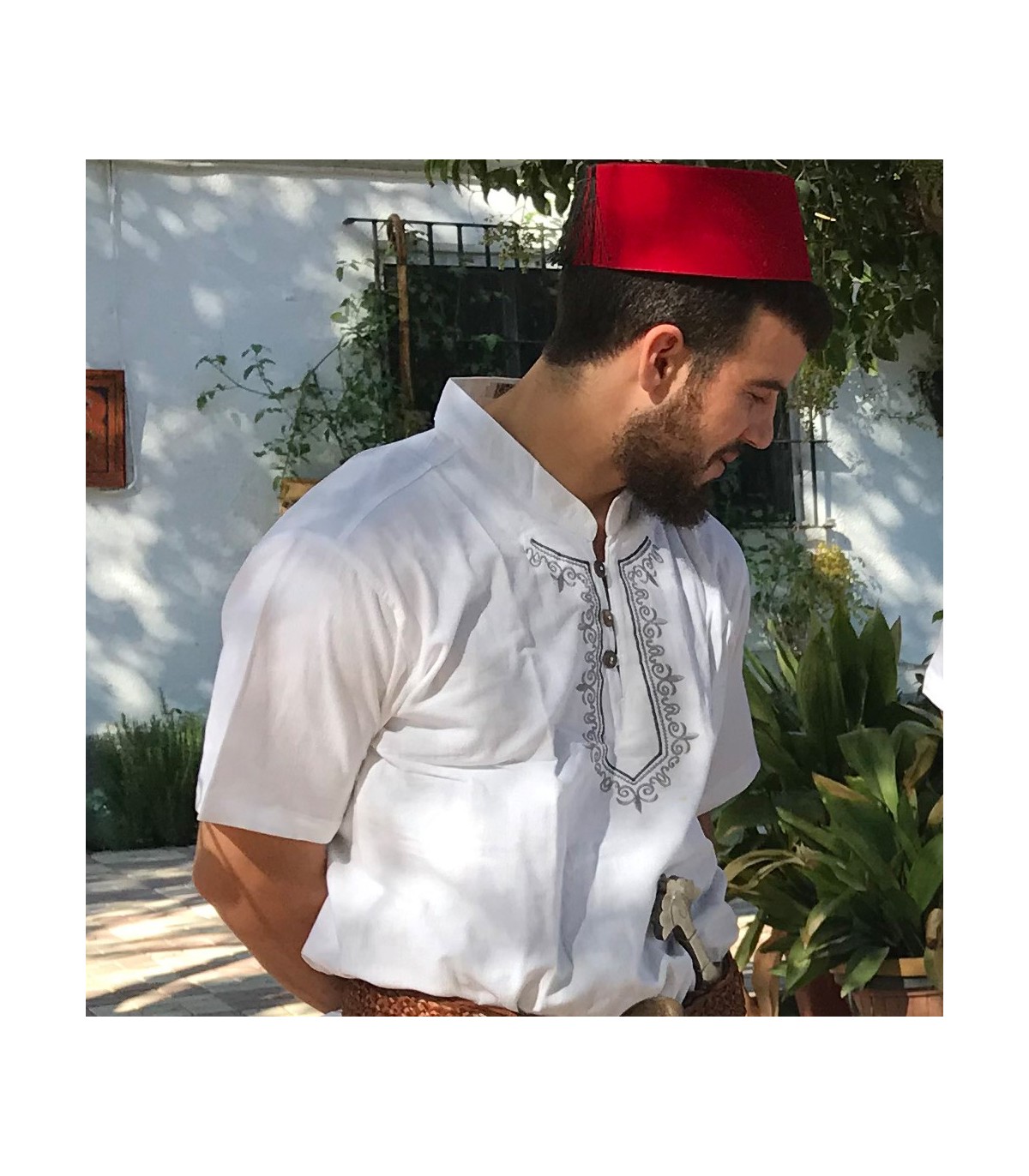 -Camisa oriental de algodón con bordados en el pecho.