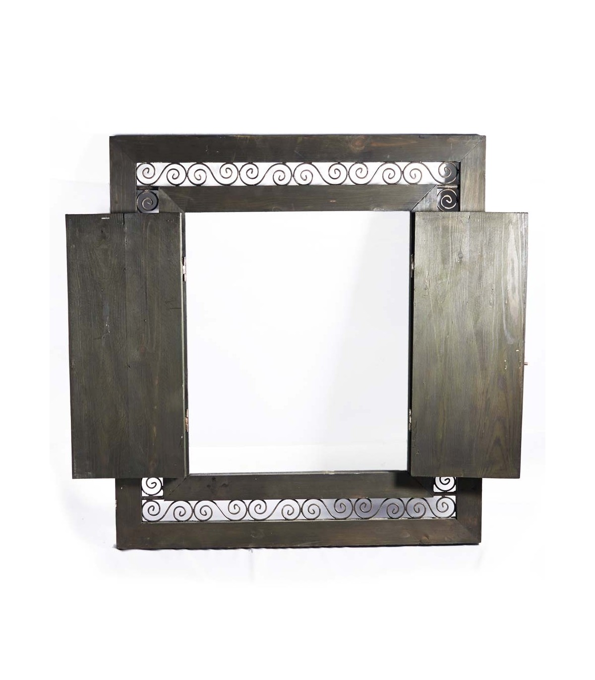 Ventana de madera decorada con celosía geométrica y floral inspirada en la Alhambra.