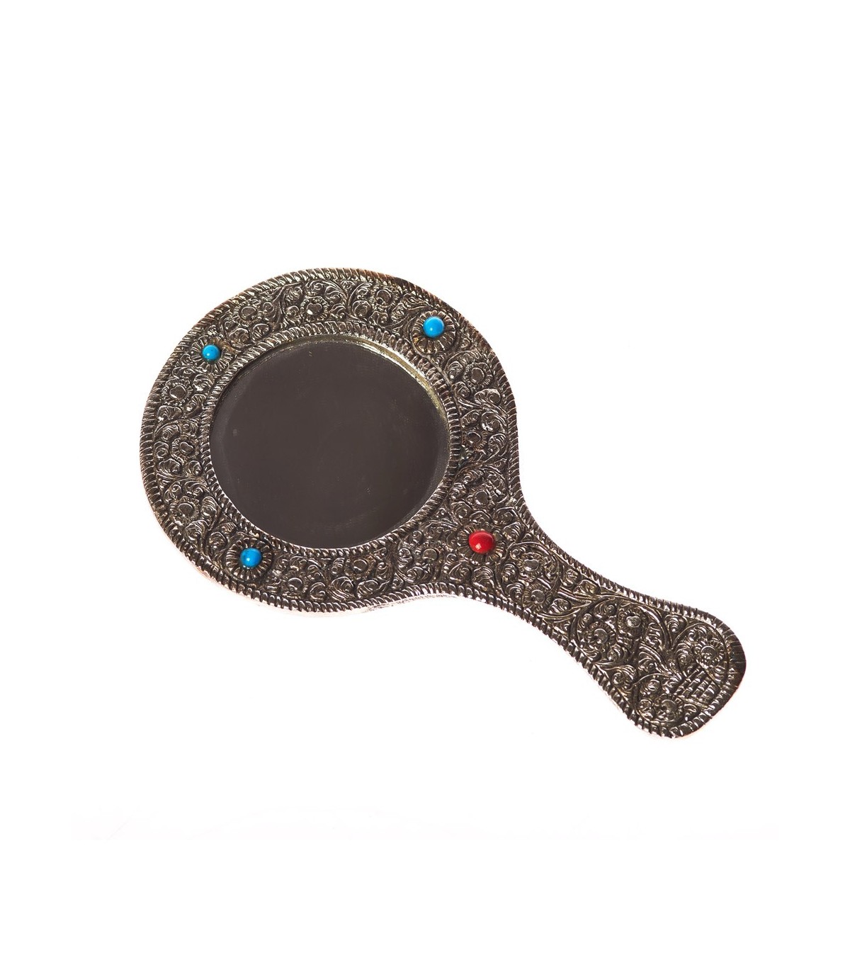 Miroir à main d'alpaga avec dessin floral et cailloux multicolores incorporées.Une pièce idéale pour les cadeaux et les collectionneurs.