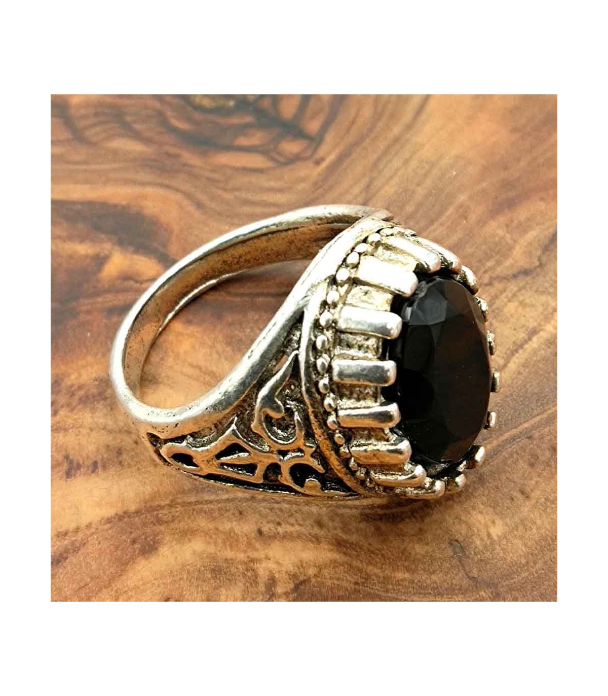 Bague de style gothique médiéval, pour gentleman. Le métal est un alliage Inox. La pierre est faite de résine synthétique