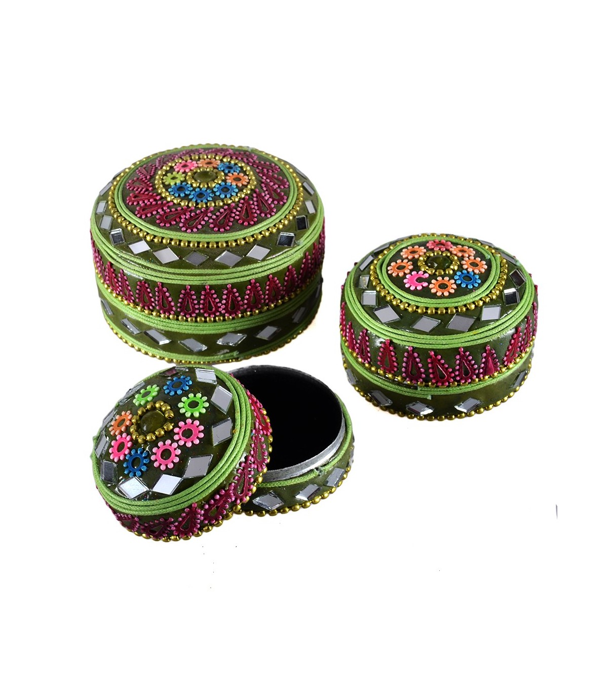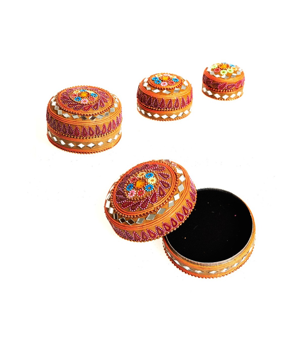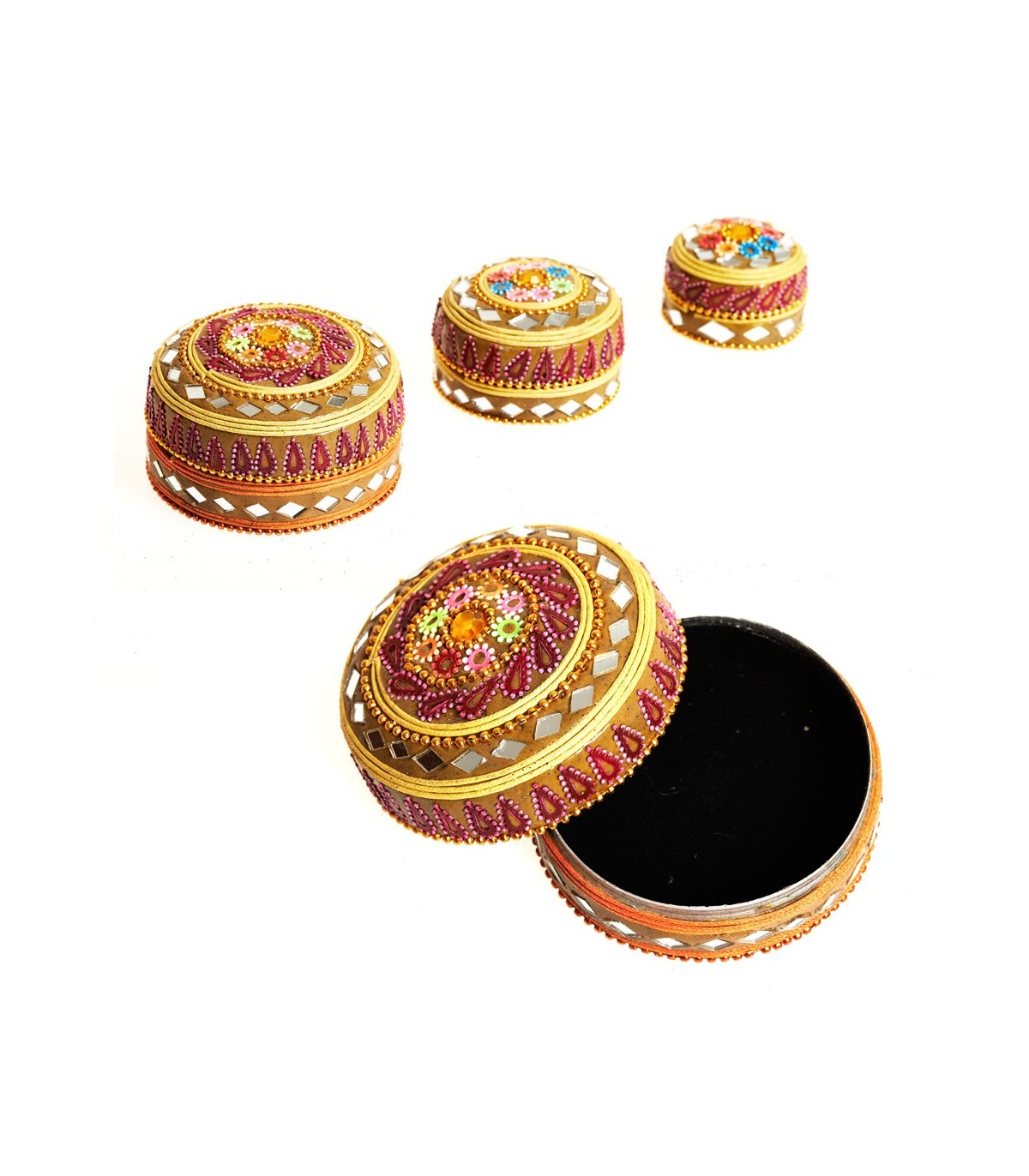 Jeu 3 boîtes orné de brillants et revêtu intérieurement à paillettes.