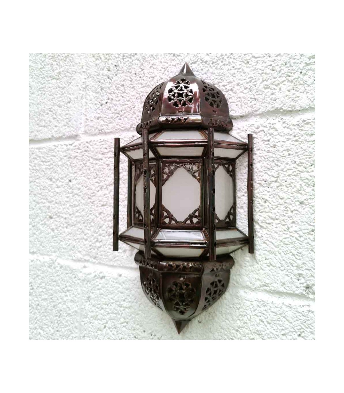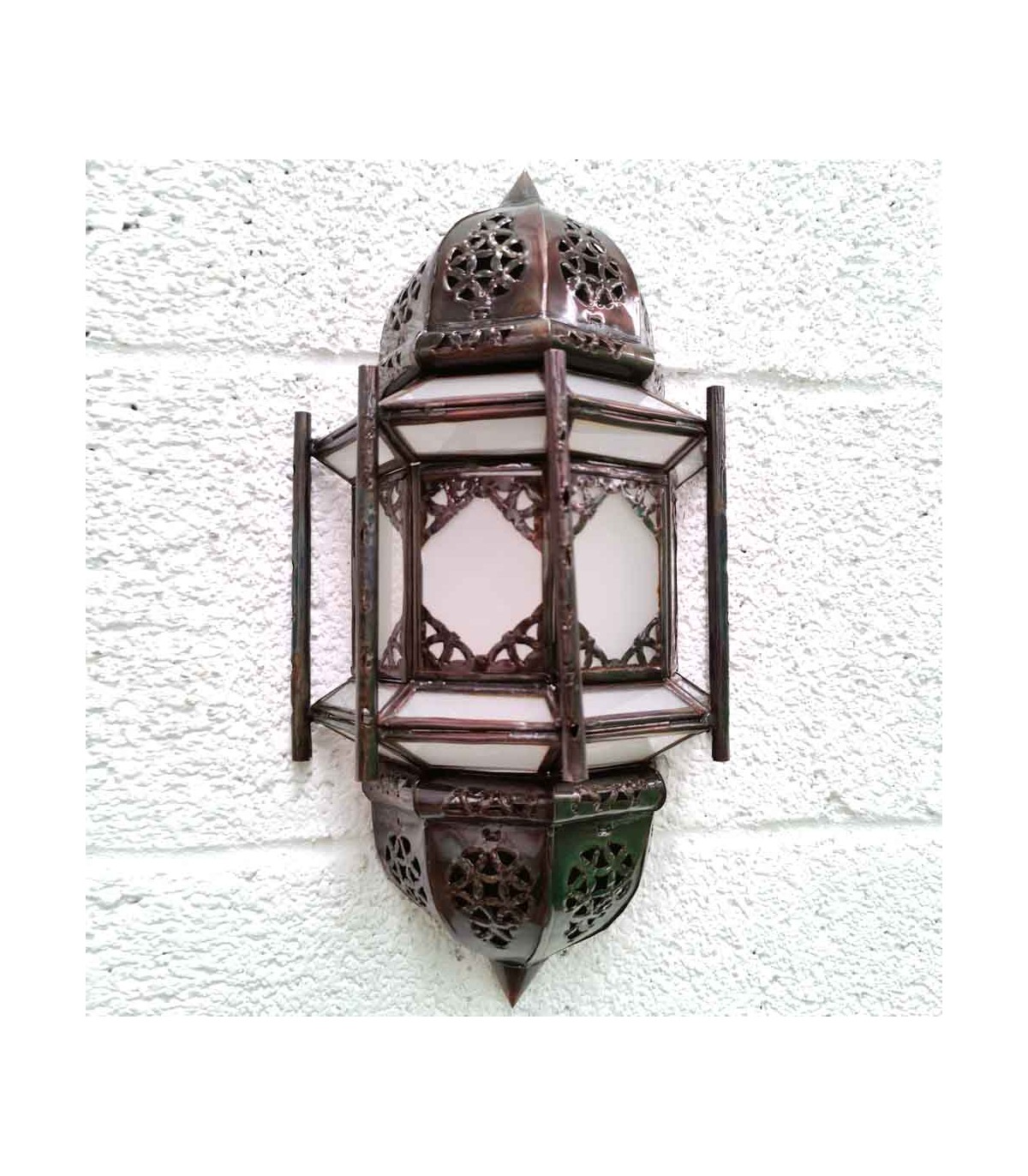 Applique marocaine de style andalou décorée de tôle ajourée et de verre blanc translucide, fabriquée artisanalement au Maroc.