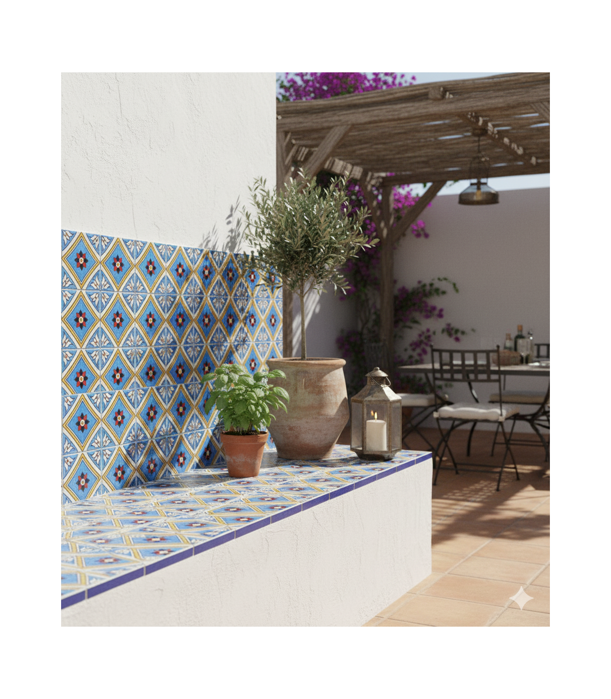 Carreaux andalous, inspirés du treillis et des motifs arabes, fabriqués à la main. Pour la décoration andalouse en revêtement de sol, créez des peintures murales décoratives, décoration de murs, sols, plafonds. Vous pouvez également faire des tables en mosaïque, ou simplement décorer un coin de votre maison ou de votre terrasse que vous trouvez beau.