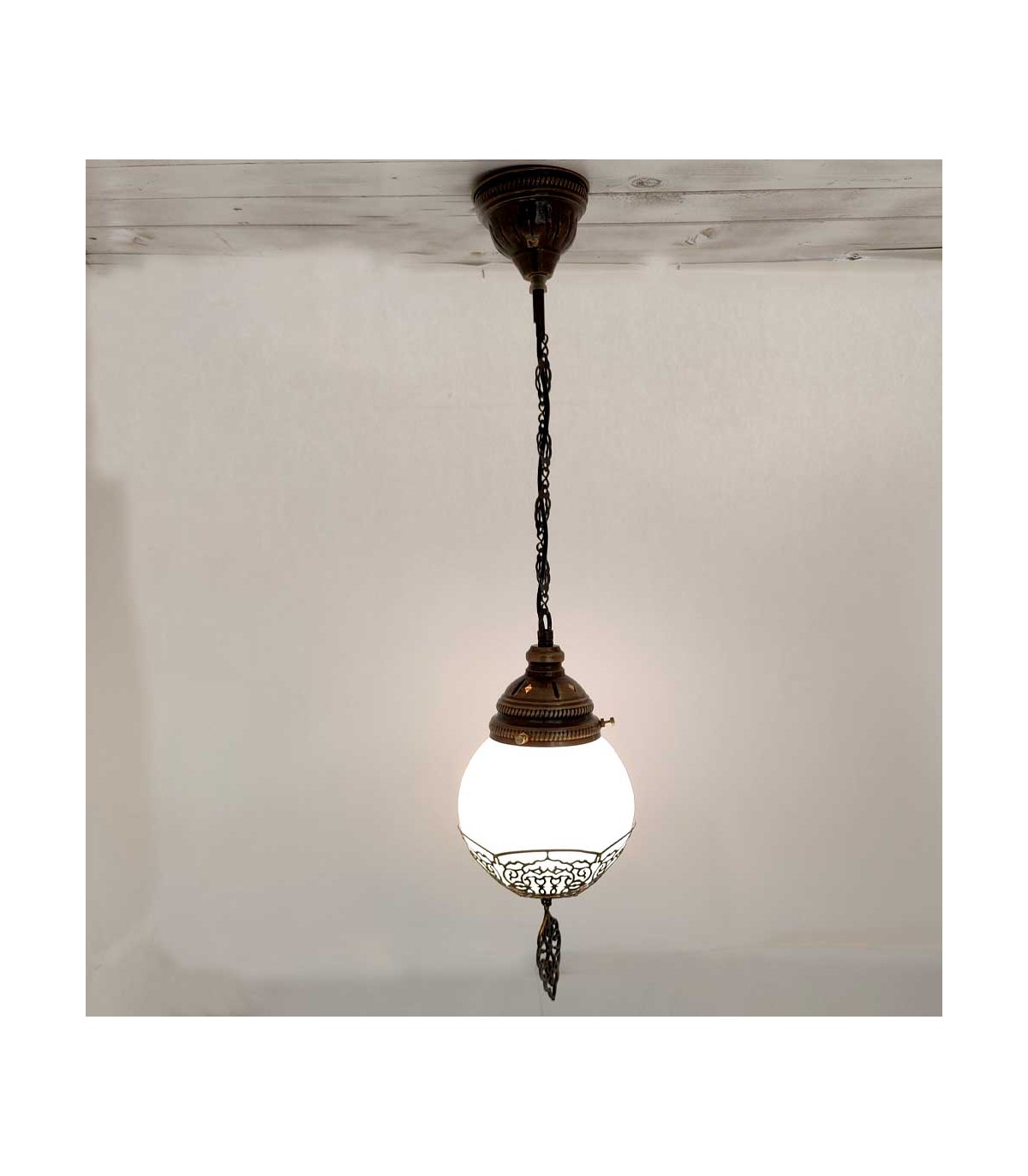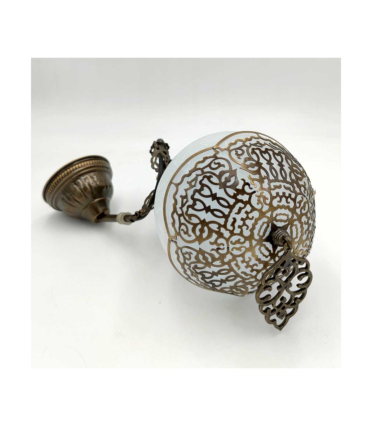 Lampe fabriquée en Turquie en métal découpé au laser et verre craquelé de couleur blanc mat. Lampe ottomane authentique.